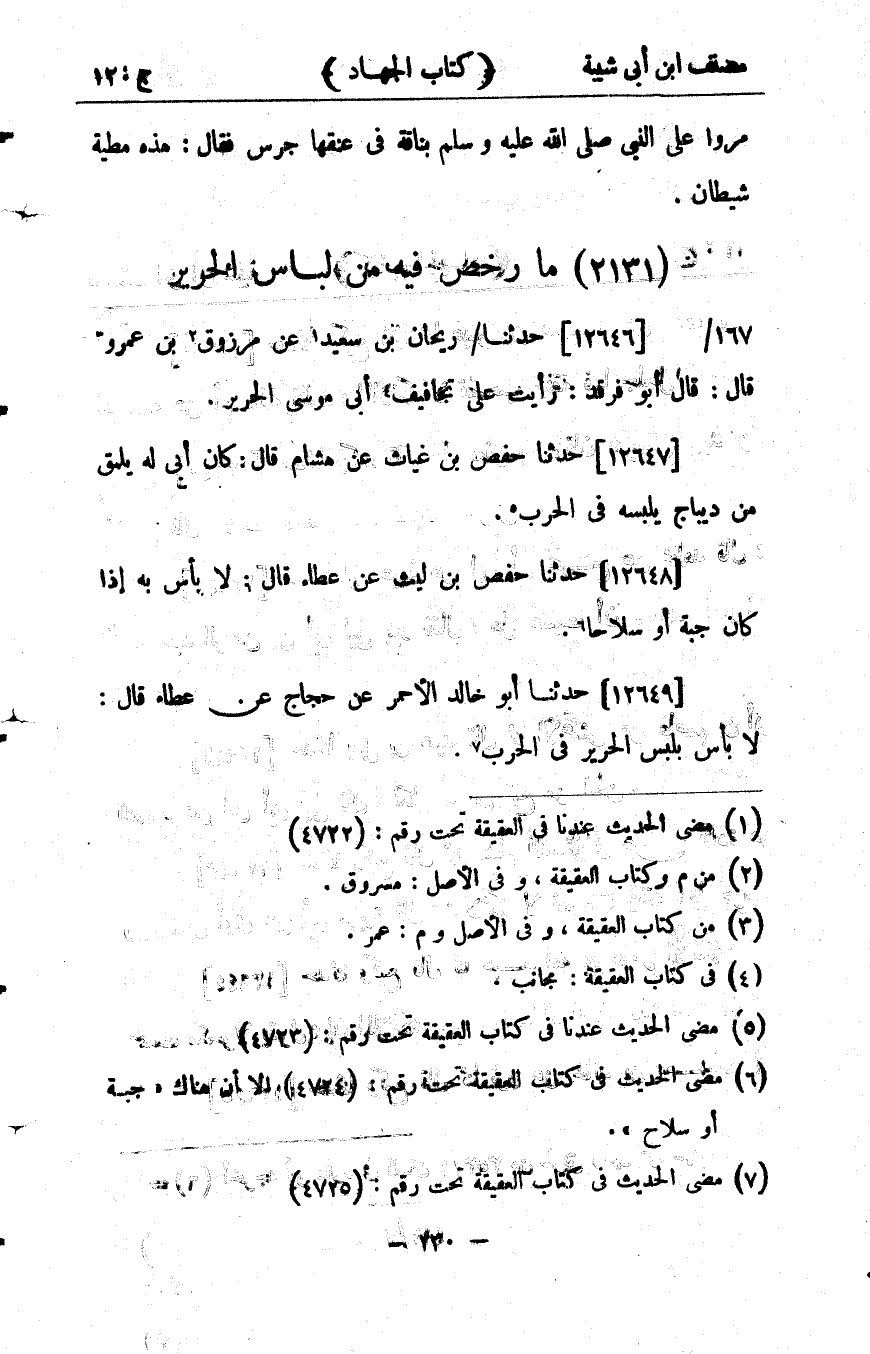 33270- حَدَّثَنَا أَبُو خَالِدٍ الأَحْمَرُ ، عَنْ حَجَّاجٍ ، عَنْ عَطَاءٍ ، قَالَ : لاَ بَأْسَ بِلُبْسِ الْحَرِيرِ فِي الْحَرْبِ.