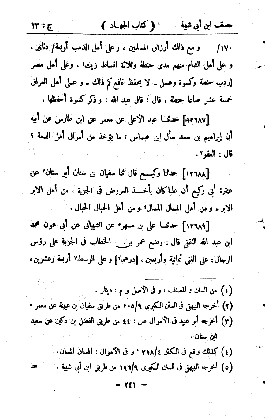 33311- حَدَّثَنَا عَلِيُّ بْنُ مُسْهِرٍ ، عَنِ الشَّيْبَانِيِّ ، عَنْ أَبِي عَوْنٍ مُحَمَّدِ بْنِ عُبَيْدِ اللهِ الثَّقَفِيِّ ، قَالَ : وَضَعَ عُمَرُ بْنُ الْخَطَّابِ يعني فِي الْجِزْيَةِ عَلَى رُؤُوسِ الرِّجَالِ : عَلَى الْغَنِيِّ ثَمَانِيَةً وَأَرْبَعِينَ , دِرْهَمًا وَعَلَى الْوَسَطِ أَرْبَعَةً وَعِشْرِينَ , وَعَلَى الْفَقِيرِ اثْنَيْ عَشَرَ دِرْهَمًا.