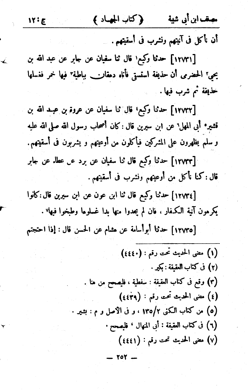 33354- حَدَّثَنَا وَكِيعٌ ، قَالَ : حدَّثَنَا سُفْيَانُ ، عَنْ عُرْوَةَ بْنِ عَبْدِ اللهِ بْنِ قُشَيْرٍ أَبِي الْمُهَلِّ ، عَنِ ابْنِ سِيرِينَ ، قَالَ : كَانَ أَصْحَابُ رَسُولِ اللهِ صلى الله عليه وسلم يَظْهَرُونَ عَلَى الْمُشْرِكِينَ فَيَأْكُلُونَ مِنْ أَوْعِيَتِهِمْ وَيَشْرَبُونَ فِي أَسْقِيَتِهِمْ.