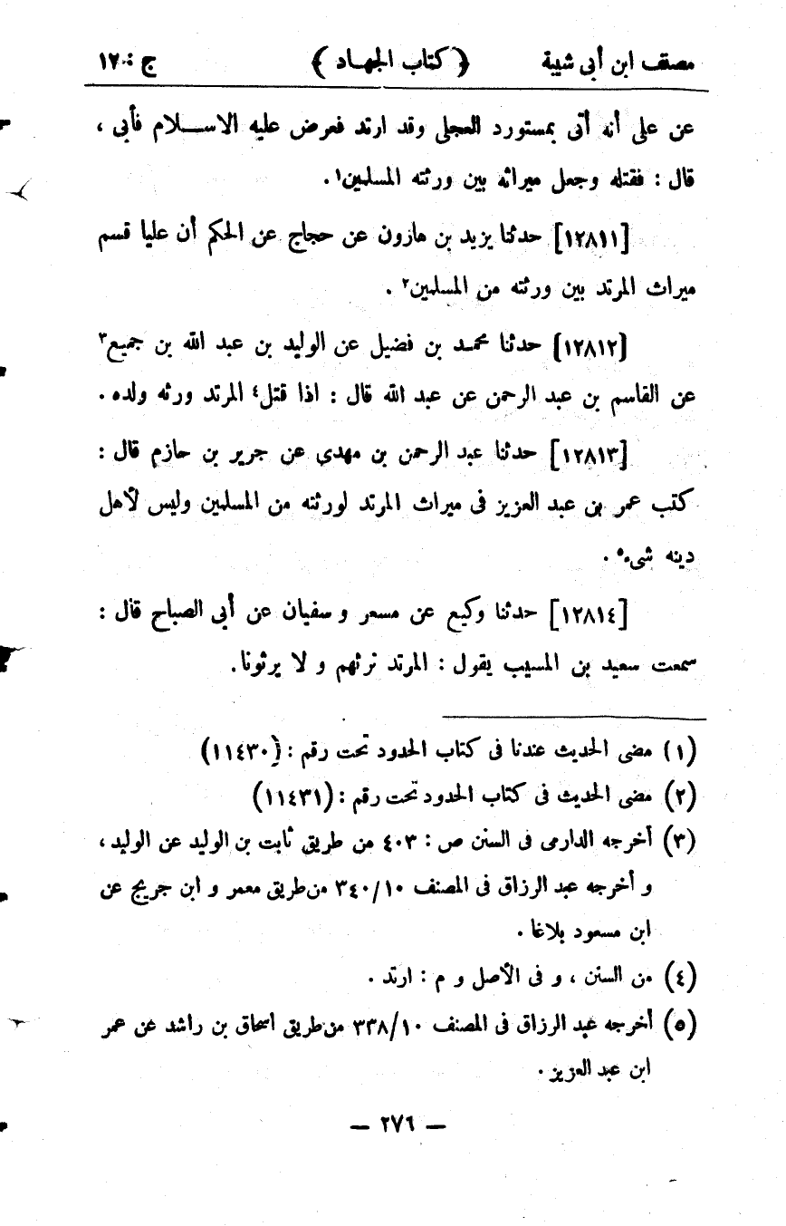33437- حَدَّثَنَا عَبْدُ الرَّحْمَن بْنُ مَهْدِيٍّ ، عَنْ جَرِيرِ بْنِ حَازِمٍ ، قَالَ : كَتَبَ عُمَرُ بْنُ عَبْدِ الْعَزِيزِ فِي مِيرَاثِ الْمُرْتَدِّ لِوَرَثَتِهِ مِنَ الْمُسْلِمِينَ وَلَيْسَ لأَهْلِ دِينِهِ شَيْءٌ.