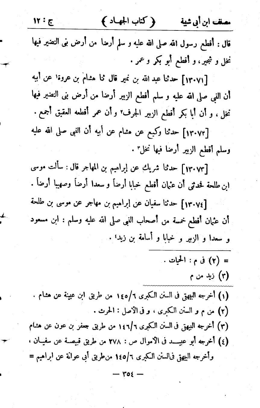 33696- حَدَّثَنَا عَبْدُ اللهِ بْنُ نُمَيْرٍ ، قَالَ : حدَّثَنَا هِشَامُ بْنُ عُرْوَةَ ، عَنْ أَبِيهِ أَنَّ النَّبِيَّ صلى الله عليه وسلم أَقْطَعَ الزُّبَيْرَ أَرْضًا مِنْ أَرْضِ بَنِي النَّضِيرِ فِيهَا نَخْلٌ ، وَأَنَّ أَبَا بَكْرٍ أَقْطَعَ الزُّبَيْرَ الْجَرْفَ ، وَأَنَّ عُمَرَ أَقْطَعَهُ الْعَقِيقَ أَجْمَعَ.