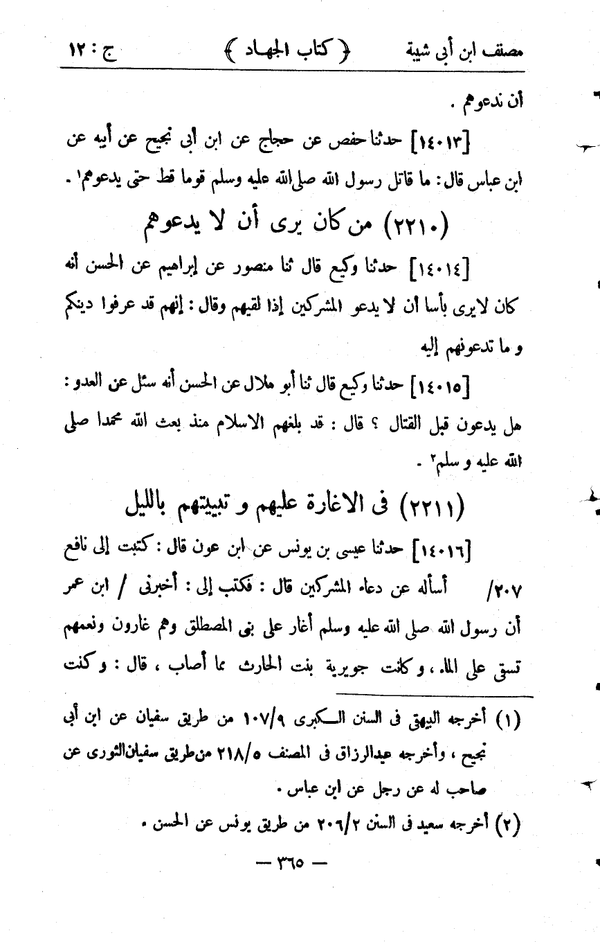 33738- حَدَّثَنَا حَفْصٌ ، عَنْ حَجَّاجٍ ، عَنِ ابْنِ أَبِي نَجِيحٍ ، عَنْ أَبِيهِ ، عَنِ ابْنِ عَبَّاسٍ ، قَالَ : مَا قَاتَلَ رَسُولُ اللهِ صلى الله عليه وسلم قَوْمًا قط حَتَّى يَدْعُوَهُمْ.