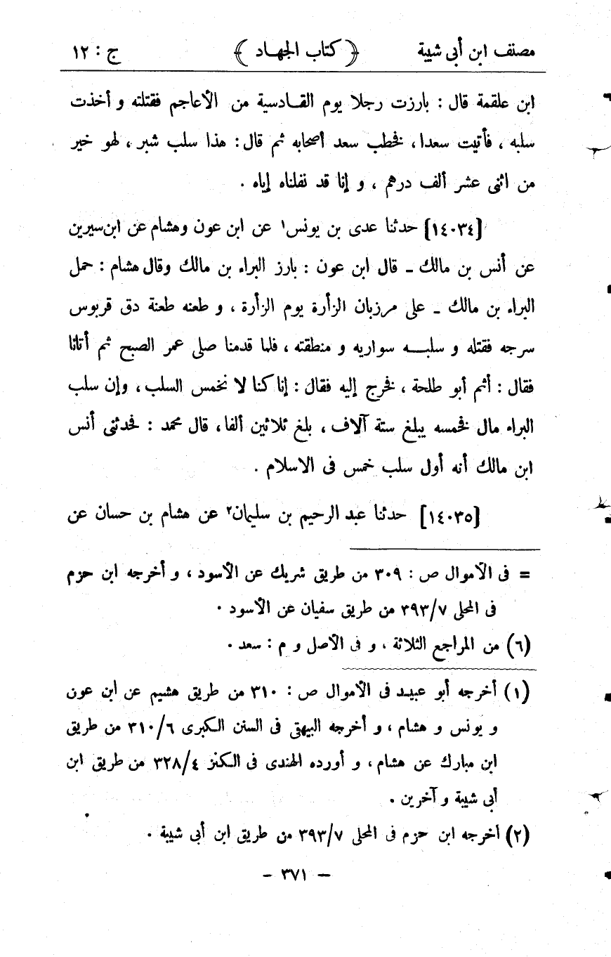 33760- حَدَّثَنَا عيِسىَ بْنُ يُونُسَ ، عَنِ ابْنِ عَوْنٍ وَهِشَامٌ ، عَنِ ابْنِ سِيرِينَ ، عَنْ أَنَسِ بْنِ مَالِكٍ ، قَالَ ابْنُ عَوْنٍ : بَارَزَ الْبَرَاءُ بْنُ مَالِكٍ ، وَقَالَ هِشَامٌ : حَمَلَ الْبَرَاءُ بْنُ مَالِكٍ عَلَى مَرْزُبَانِ الزَّارَةِ يَوْمَ الزَّارَةِ , وَطَعَنَهُ طَعْنَةً ، دَقَّ قَرْبُوسَ سَرْجِهِ فَقَتَلَهُ وَسَلَبَهُ سِوَارَيْهِ وَمِنْطَقَتَهُ ، فَلَمَّا قَدِمْنَا صَلَّى عُمَرُ الصُّبْحَ ، ثُمَّ أَتَانَا ، فَقَالَ : أَثَمَّ أَبُو طَلْحَةَ ؟ فَخَرَجَ إلَيْهِ ، فَقَالَ : إنَّا كُنَّا لاَ نُخَمِّسُ السَّلَبَ ، وَإِنَّ سَلَبَ الْبَرَاءِ مَالٌ فَخُمُسُهُ فَبَلَغَ سِتَّةَ آلاَفٍ , بَلَغَ ثَلاَثِينَ أَلْفًا ، قَالَ مُحَمَّدُ : فَحَدَّثَنِي أَنَسُ بْنُ مَالِكٍ أَنَّهُ أَوَّلُ سَلَبٍ خُمِّسَ فِي الإِسْلاَمِ.