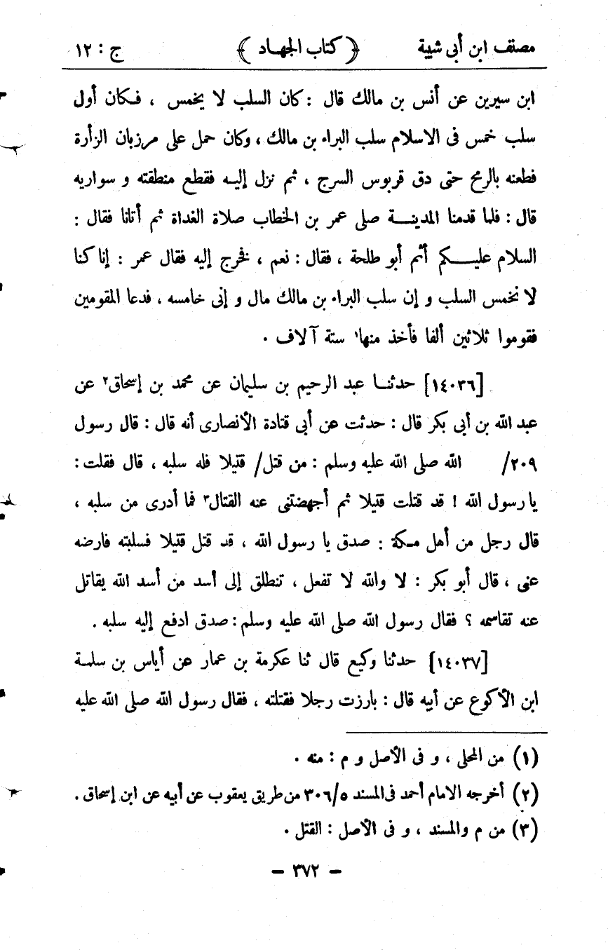 33762- حَدَّثَنَا عَبْدُ الرَّحِيمِ بْنُ سُلَيْمَانَ ، عَنْ مُحَمَّدِ بْنِ إِسْحَاقَ ، عَنْ عَبْدِ اللهِ بْنِ أَبِي بَكْرٍ ، قَالَ : حدِّثْتُ ، عَنْ أَبِي قَتَادَةَ الأَنْصَارِيِّ أَنَّهُ قَالَ : قَالَ رَسُولُ اللهِ صلى الله عليه وسلم : مَنْ قَتَلَ قَتِيلاً فَلَهُ سَلَبُهُ قَالَ ، فَقُلْتُ : يَا رَسُولَ اللهِ , قَدْ قَتَلْت قَتِيلاً ذا سلب ، ثُمَّ أَجْهَضَتْنِي عَنْهُ الْقِتَالُ فَمَا أَدْرِي مَنْ سَلَبَهُ ، قَالَ رَجُلٌ مِنْ أَهْلِ مَكَّةَ : صَدَقَ يَا رَسُولَ اللهِ , قَدْ قَتَلَ قَتِيلاً فَسَلَبْتُهُ فَأرْضِهِ عَنِّي ، قَالَ أَبُو بَكْرٍ : لاَ وَاللهِ لاَ تَفْعَلْ , تَنْطَلِقُ إلَى أَسَدٍ مِنْ أُسْدِ اللهِ يُقَاتِلُ عَنْهُ تُقَاسِمُهُ ، فَقَالَ رَسُولُ اللهِ صلى الله عليه وسلم : صَدَقَ ادْفَعْ إلَيْهِ سَلَبَهُ.