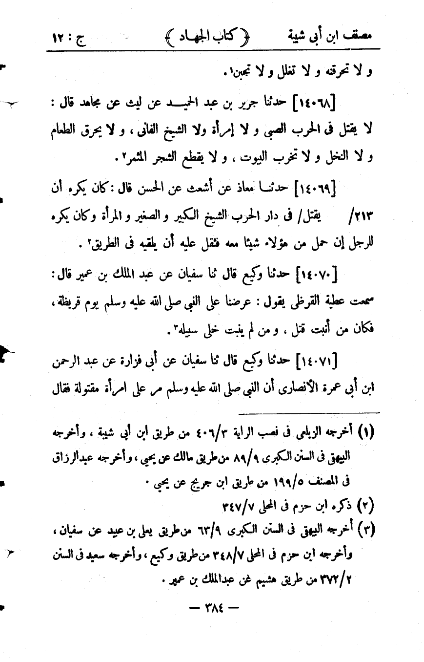 33794- حَدَّثَنَا جَرِيرُ بْنُ عَبْدِ الْحَمِيدِ ، عَنْ لَيْثٍ ، عَنْ مُجَاهِدٍ ، قَالَ : لاَ يُقْتَلُ فِي الْحَرْبِ الصَّبِيُّ ، وَلاَ الْمَرْأَةٌ ، وَلاَ الشَّيْخُ الْفَانِي , وَلاَ يُحْرَقُ الطَّعَامُ ، وَلاَ النَّخْلُ ، وَلاَ تُخَرَّبُ الْبُيُوتُ , وَلاَ يُقْطَعُ الشَّجَرُ الْمُثْمِرُ.