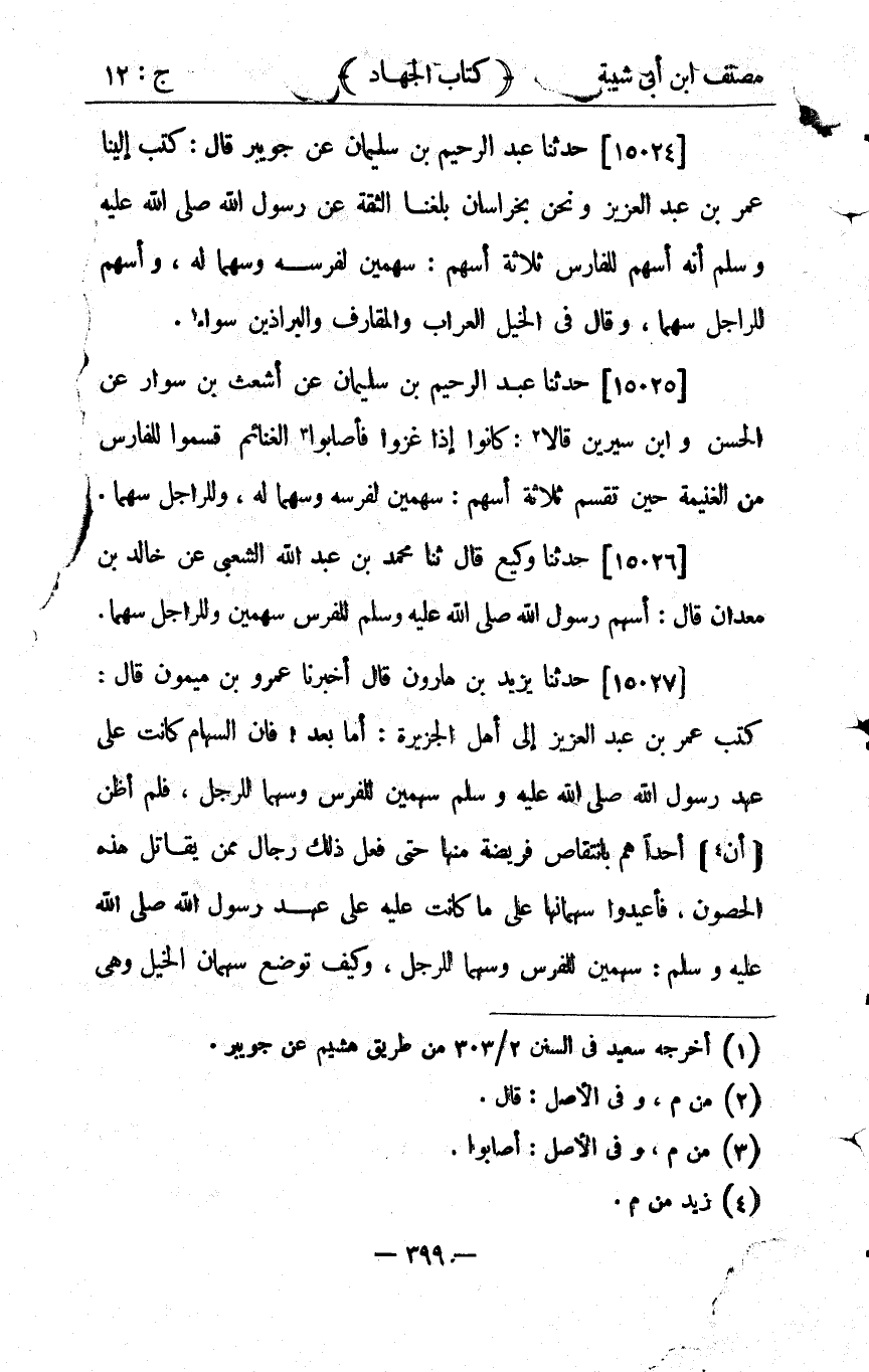 33850- حَدَّثَنَا عَبْدُ الرَّحِيمِ بْنُ سُلَيْمَانَ ، عَنْ جُوَيْبِرٍ ، قَالَ : كَتَبَ إِلَيْنَا عُمَرُ بْنُ عَبْدِ الْعَزِيزِ وَنَحْنُ بِخُرَاسَانَ : بَلَّغَنَا الثِّقَةُ عَنْ رَسُولِ اللهِ صلى الله عليه وسلم ؛ أَنَّهُ أَسْهَمَ لِلْفَارِسِ ثَلاَثَةَ أَسْهُمٍ ؛ سَهْمَيْنِ لِفَرَسِهِ ، وَسَهْمًا لَهُ , وَأَسْهَمَ لِلرَّاجِلِ سَهْمًا ، وَقَالَ فِي الْخَيْلِ : الْعِرَابُ وَالْمُقَارِفُ وَالْبَرَاذِينُ سَوَاءٌ.