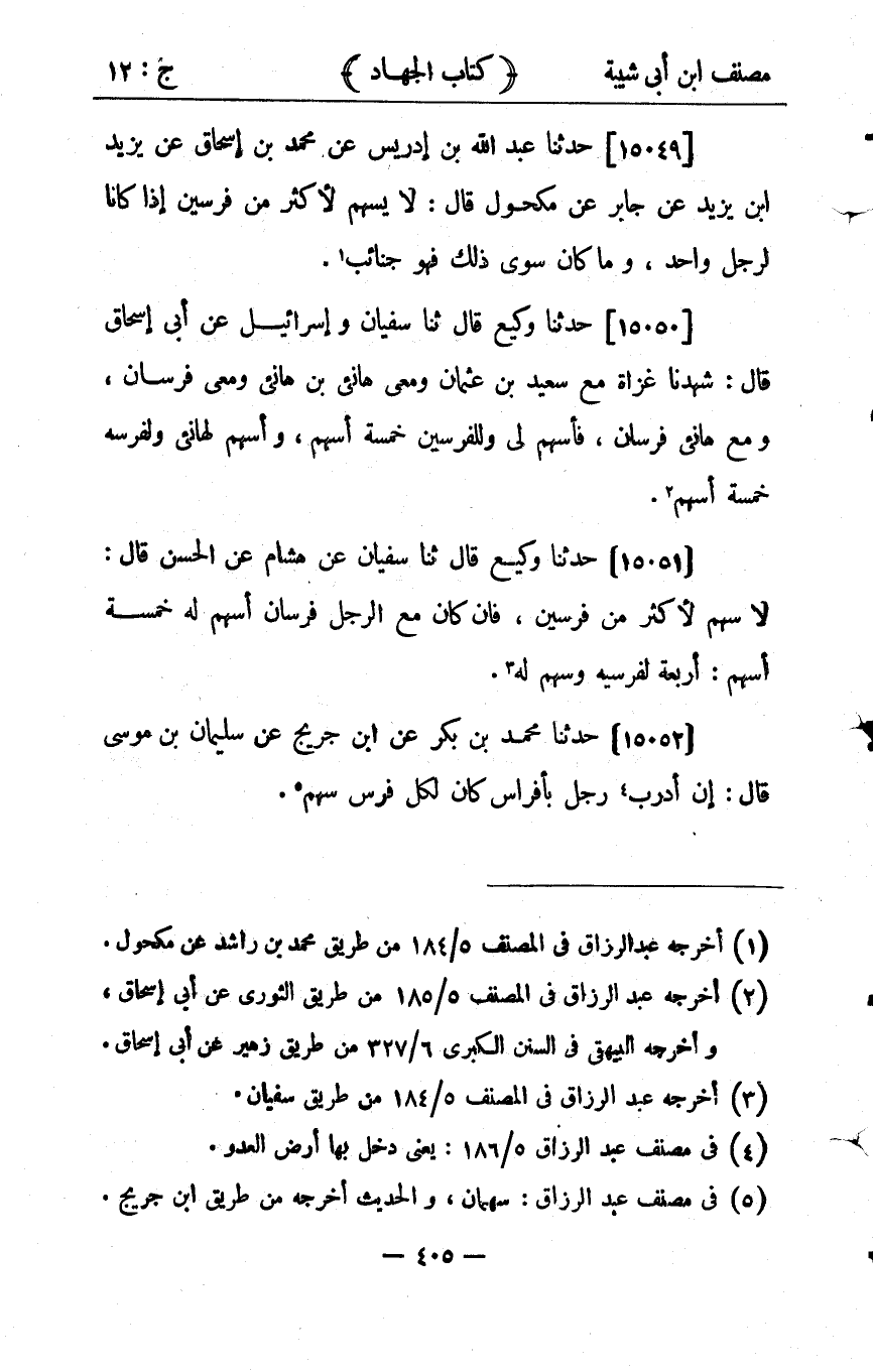 33877- حَدَّثَنَا عَبْدُ اللهِ بْنُ إِدْرِيسَ ، عَنْ مُحَمَّدِ بْنِ إِسْحَاقَ ، عَنْ يَزِيدَ بْنِ يَزِيدَ بن جَابِرٍ ، عَنْ مَكْحُولٍ ، قَالَ : لاَ يُسْهَمُ لأَكْثَرِ مِنْ فَرَسَيْنِ إِذَا كَانَا لِرَجُلٍ وَاحِدٍ ، وَمَا كَانَ سِوَى ذَلِكَ فَهُوَ جَنَائِبُ.