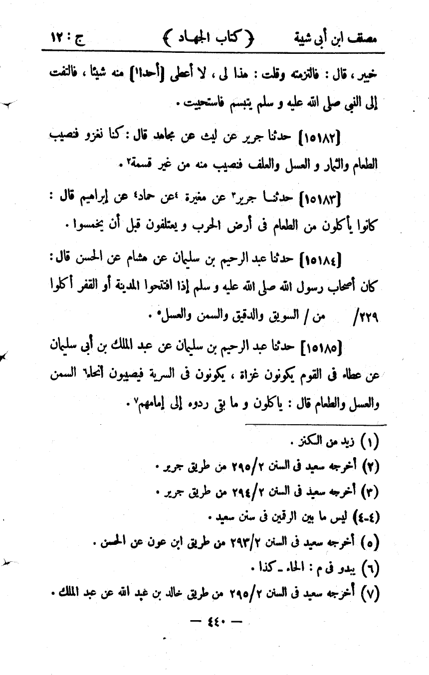 34016- حَدَّثَنَا جَرِيرٌ ، عَنْ لَيْثٍ ، عَنْ مُجَاهِدٍ ، قَالَ : كُنَّا نَغْزُو فَنُصِيبُ الطَّعَامَ ، وَالثِّمَارَ ،وَالْعَسَلَ ، وَالْعَلَفَ ، فَنُصِيبُ مِنْهُ مِنْ غَيْرِ قِسْمَةٍ.