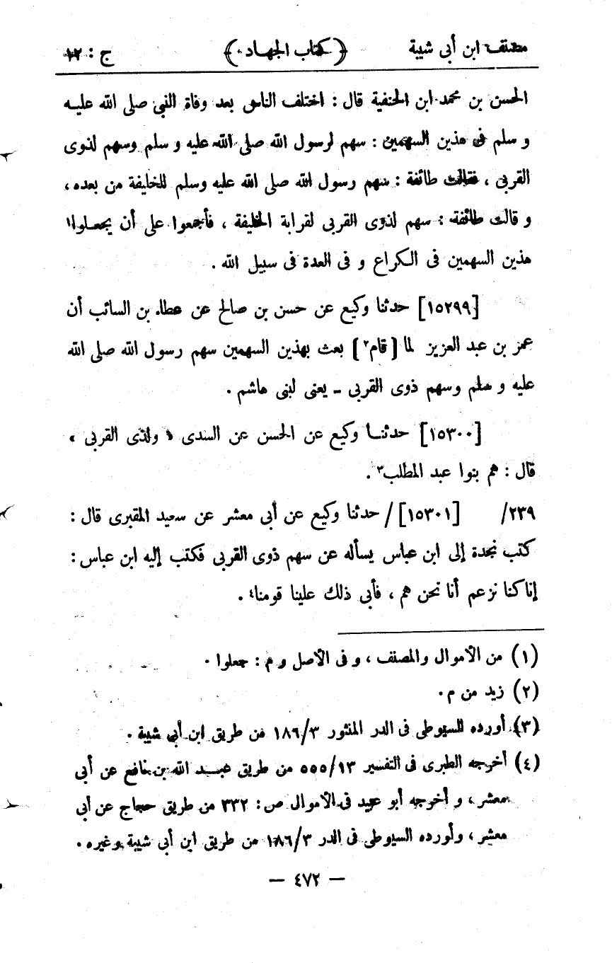 34136- حَدَّثَنَا وَكِيعٌ ، قَالَ : حدَّثَنَا سُفْيَانُ ، عَنْ قَيْسِ بْنِ مُسْلِمٍ ، عَنِ الْحَسَنِ بْنِ مُحَمَّدِ بْنِ الْحَنَفِيَّةِ ، قَالَ : اخْتَلَفَ النَّاسُ بَعْدَ وَفَاةِ النَّبِيِّ صلى الله عليه وسلم فِي هَذَيْنِ السَّهْمَيْنِ ؛ سَهْمِ الرَّسُولِ صلى الله عليه وسلم ، وَسَهْمِ ذَوِي الْقُرْبَى ، فَقَالَتْ طَائِفَةٌ : سَهْمُ الرَّسُولِ صلى الله عليه وسلم لِلْخَلِيفَةِ مِنْ بَعْدِهِ , وَقَالَتْ طَائِفَةٌ : سَهْمُ ذَوِي الْقُرْبَى لِقَرَابَةِ الْخَلِيفَةِ , فَأَجْمَعُوا عَلَى أَنْ يَجْعَلُوا هَذَيْنِ السَّهْمَيْنِ فِي الْكُرَاعِ ، وَفِي الْعُدَّةِ فِي سَبِيلِ اللهِ.