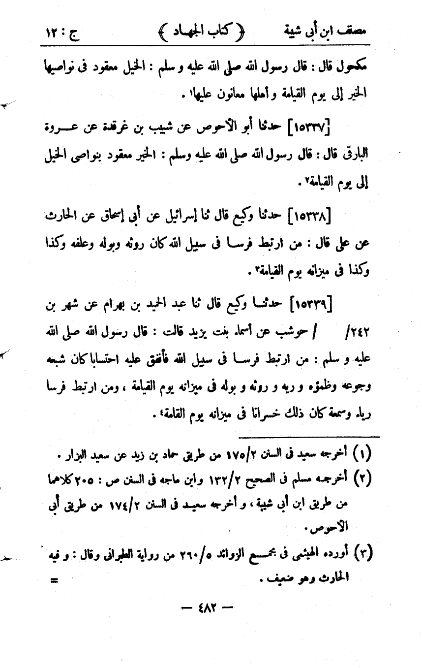 34177- حَدَّثَنَا وَكِيعٌ ، قَالَ : حَدَّثَنَا عَبْدُ الْحَمِيدِ بْنُ بَهْرَامَ ، عْن شَهْرِ بْن حَوْشَبٍ ، عَنْ أَسْمَاءَ بِنْتِ يَزِيدَ ، قَالَتْ : قَالَ رَسُولُ اللهِ صلى الله عليه وسلم : مَنِ ارْتَبَطَ فَرَسًا فِي سَبِيلِ اللهِ ، فَأَنْفَقَ عَلَيْهِ احْتِسَابًا كَانَ شِبَعُهُ وَجُوعُهُ , وَظَمَؤُهُ ، وَرِيُّهُ ، وَرَوْثُهُ ، وَبَوْلُهُ فِي مِيزَانِهِ يَوْمَ الْقِيَامَةِ , وَمَنَ ارْتَبَطَ فَرَسًا رِيَاءً وَسُمْعَةً كَانَ ذَلِكَ خُسْرَانًا فِي مِيزَانِهِ يَوْمَ الْقِيَامَةِ.