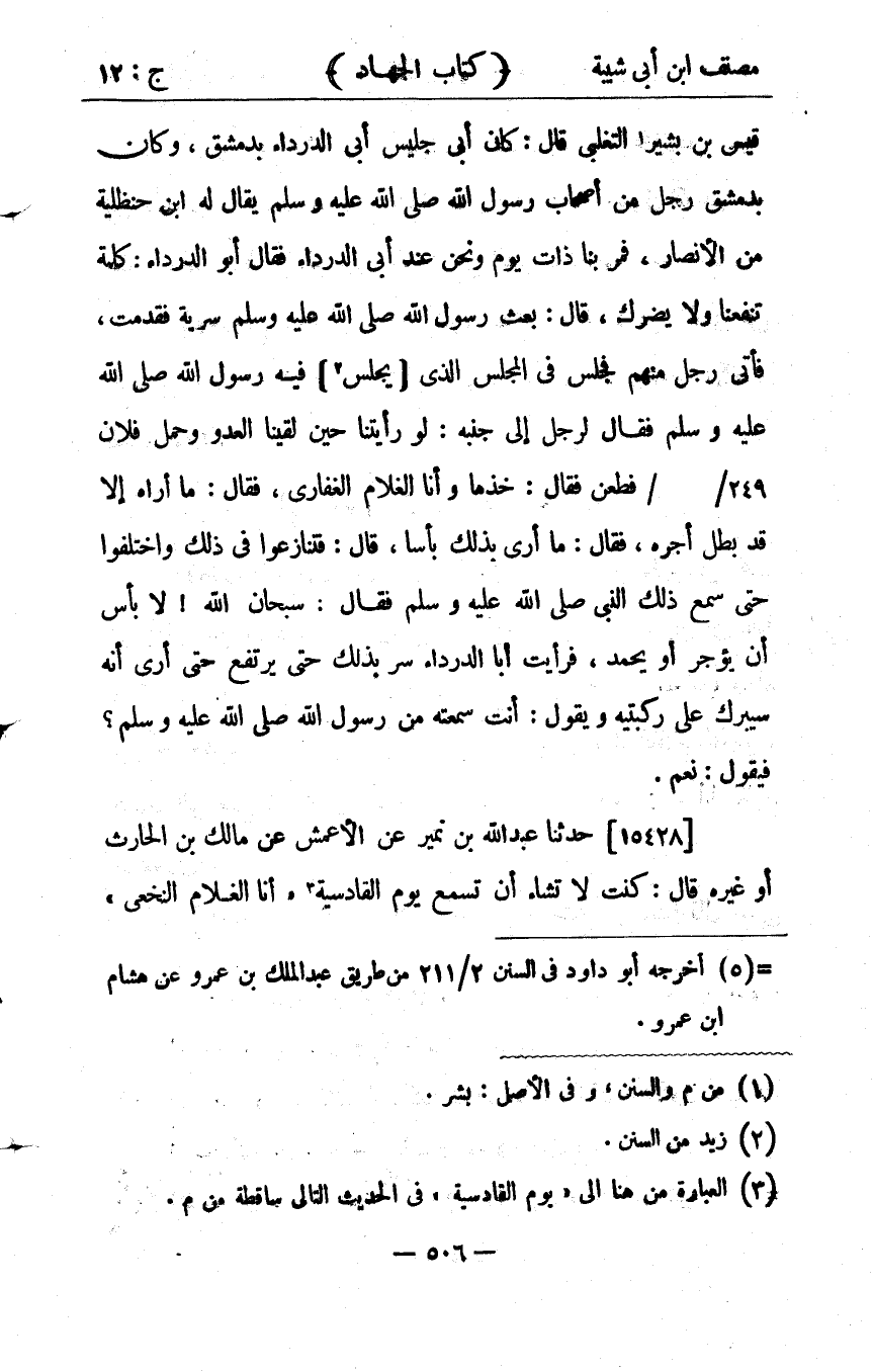 34266- حَدَّثَنَا عَبْدُ اللهِ بْنُ نُمَيْرٍ ، قَالَ : حدَّثَنَا هِشَامُ بْنُ سَعْدٍ ، قَالَ : حَدَّثَنِي قَيْسُ بْنُ بَشِيرٍ التَّغْلِبِيُّ ، قَالَ : كَانَ أَبِي جَلِيسَ أَبِي الدَّرْدَاءِ بِدِمَشْقَ , وَكَانَ بِدِمَشْقَ رَجُلٌ مِنْ أَصْحَابِ رَسُولِ اللهِ صلى الله عليه وسلم ، يُقَالَ لَهُ : ابْنُ الْحَنْظَلِيَّةَ ، مِنَ الأَنْصَارِ , فَمَرَّ بِنَا ذَاتَ يَوْمٍ وَنَحْنُ عِنْدَ أَبِي الدَّرْدَاءِ ، فَقَالَ أَبُو الدَّرْدَاءِ : كَلِمَةً تَنْفَعُنَا وَلاَ تَضُرُّك ، قَالَ : بَعَثَ رَسُولُ اللهِ صلى الله عليه وسلم سَرِيَّةً فَقَدِمَتْ , فَأَتَى رَجُلٌ مِنْهُمْ فَجَلَسَ فِي الْمَجْلِسِ الَّذِي فِيهِ رَسُولُ اللهِ صلى الله عليه وسلم ، فَقَالَ لِرَجُلٍ إِلَى جَنْبِهِ : لَوْ رَأَيْتنَا حِينَ لَقِينَا الْعَدُوَّ ، حَمَلَ فُلاَنٌ فَطَعَنَ ، فَقَالَ : خُذْهَا وَأَنَا الْغُلاَمُ الْغِفَارِيُّ ، فَقَالَ : مَا أُرَاهُ إِلاَّ قَدْ أَبْطَلَ أَجْرَهُ ، فَقَالَ : مَا أَرَى بِذَلِكَ بَأْسًا ، قَالَ : فَتَنَازَعُوا فِي ذَلِكَ وَاخْتَلَفُوا حَتَّى سَمِعَ ذَلِكَ النَّبِيُّ صلى الله عليه وسلم ، فَقَالَ : سُبْحَانَ اللهِ , لاَ بَأْسَ أَنْ يُؤْجَرَ وَيُحْمَدَ ، فَرَأَيْتُ أَبَا الدَّرْدَاءِ سُرَّ بِذَلِكَ حَتَّى يَرْتَفِعَ ، حَتَّى أَرَى أَنَّهُ سَيَبْرُكُ عَلَى رُكْبَتَيْهِ ، وَيَقُولُ : أَنْتَ سَمِعْتُهُ مِنْ رَسُولِ اللهِ صلى الله عليه وسلم ؟ فَيَقُولُ : نَعَمْ.