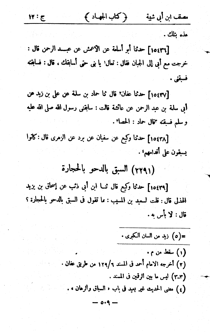 34277- حَدَّثَنَا وَكِيعٌ ، عَنْ سُفْيَانَ ، عَنْ بُرْدٍ ، عَنِ الزُّهْرِيِّ ، قَالَ : كَانُوا يَسْتبقُونَ عَلَى أَقْدَامِهِمْ.