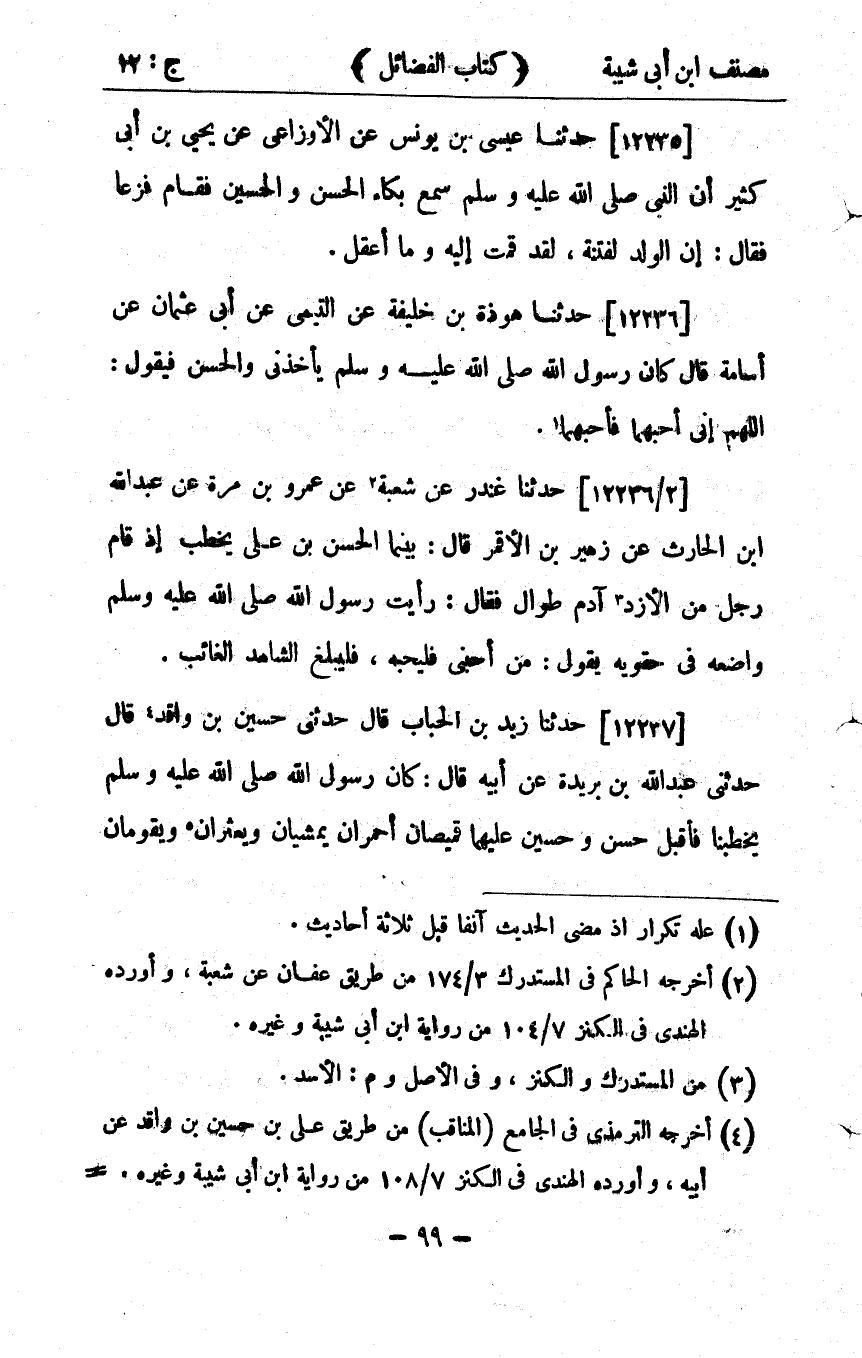 32851- حَدَّثَنَا هَوْذَةُ بْنُ خَلِيفَةَ , عَنِ التَّيْمِيِّ , عَنْ أَبِي عُثْمَانَ , عَنْ أُسَامَةَ قَالَ : كَانَ رَسُولُ اللهِ صلى الله عليه وسلم يَأْخُذُنِي وَالْحَسَنَ فَيَقُولُ : اللَّهُمَّ إنِّي أُحِبُّهُمَا فَأَحِبَّهُمَا.