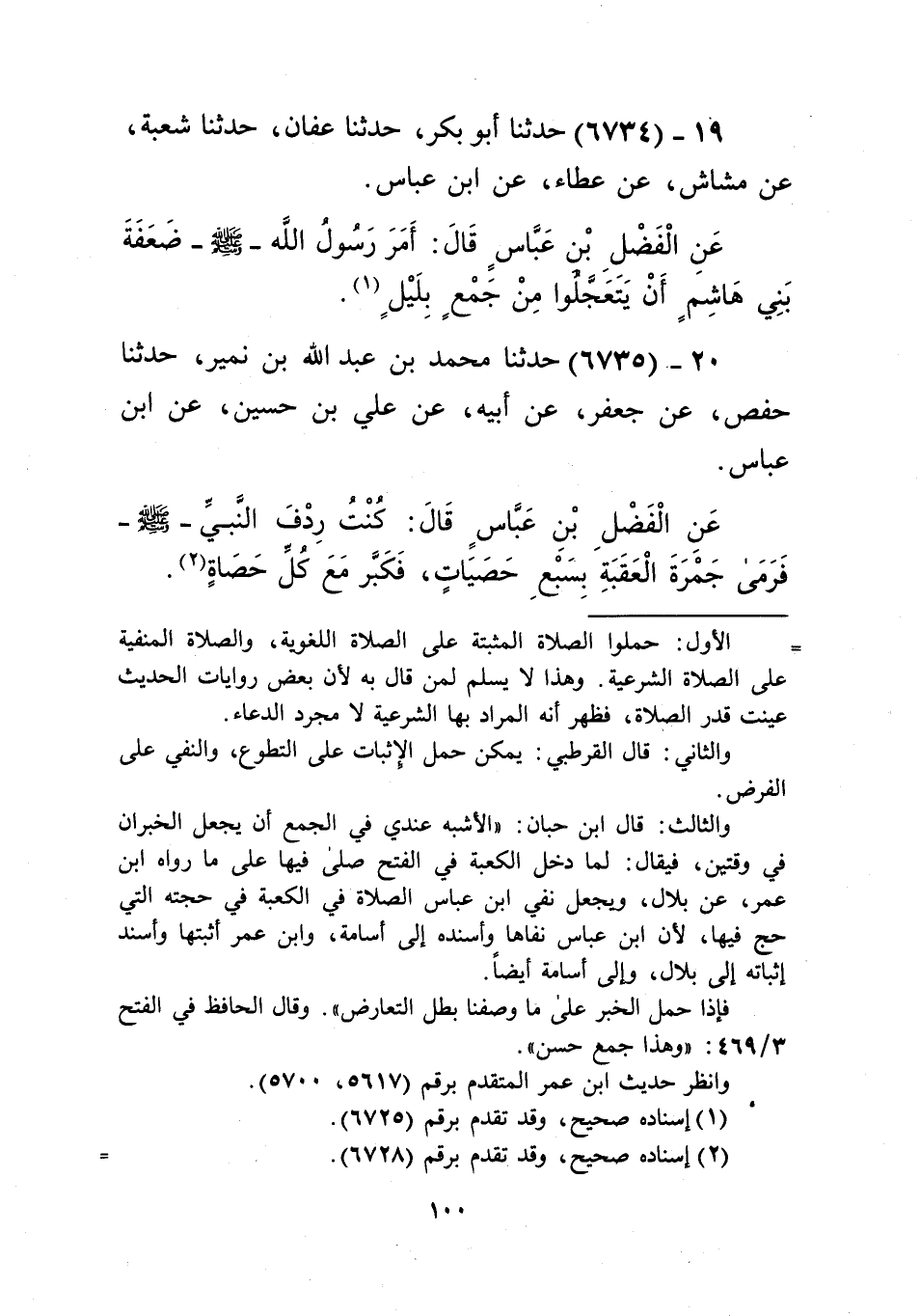 6734 - حَدَّثَنَا أَبُو بَكْرٍ، حَدَّثَنَا عَفَّانُ، حَدَّثَنَا شُعْبَةُ، عَنْ مُشَاشٍ، عَنْ عَطَاءٍ، عَنِ ابْنِ عَبَّاسٍ، عَنِ الْفَضْلِ بْنِ عَبَّاسٍ قَالَ: «§أَمَرَ رَسُولُ اللَّهِ صَلَّى اللهُ عَلَيْهِ وَسَلَّمَ ضَعَفَةَ بَنِي هَاشِمٍ أَنْ يَتَعَجَّلُوا مِنْ جَمْعٍ بِلَيْلٍ» Kإسناده صحيح
