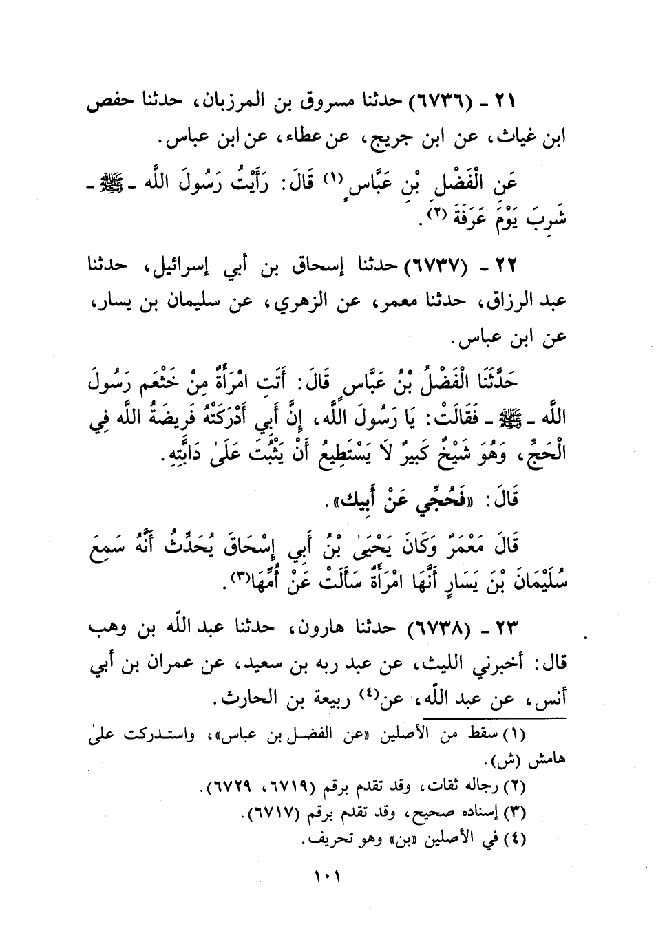 6736 - حَدَّثَنَا مَسْرُوقُ بْنُ الْمَرْزُبَانِ، حَدَّثَنَا حَفْصُ بْنُ غِيَاثٍ، عَنِ ابْنِ جُرَيْجٍ، عَنْ عَطَاءٍ، عَنِ ابْنِ عَبَّاسٍ، عَنِ الْفَضْلِ بْنِ عَبَّاسٍ قَالَ: رَأَيْتُ رَسُولَ اللَّهِ صَلَّى اللهُ عَلَيْهِ وَسَلَّمَ «§شَرِبَ يَوْمَ عَرَفَةَ» Kرجاله ثقات