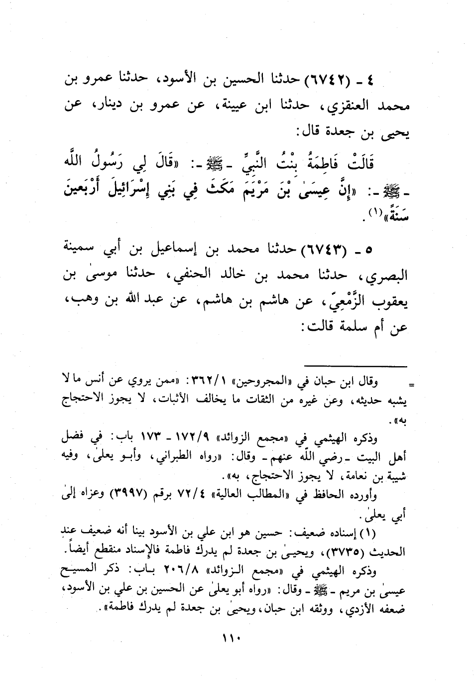 6742 - حَدَّثَنَا الْحُسَيْنُ بْنُ الْأَسْوَدَ، حَدَّثَنَا عَمْرُو بْنُ مُحَمَّدٍ الْعَنْقَزِيُّ، حَدَّثَنَا ابْنُ عُيَيْنَةَ، عَنْ عَمْرِو بْنِ دِينَارٍ، عَنْ يَحْيَى بْنِ جَعْدَةَ قَالَ: قَالَتْ فَاطِمَةُ بِنْتُ النَّبِيِّ صَلَّى اللهُ عَلَيْهِ وَسَلَّمَ: قَالَ لِي رَسُولُ اللَّهِ صَلَّى اللهُ عَلَيْهِ وَسَلَّمَ: «إِنَّ §عِيسَى ابْنَ مَرْيَمَ مَكَثَ فِي بَنِي إِسْرَائِيلَ أَرْبَعِينَ سَنَةً» Kإسناده ضعيف