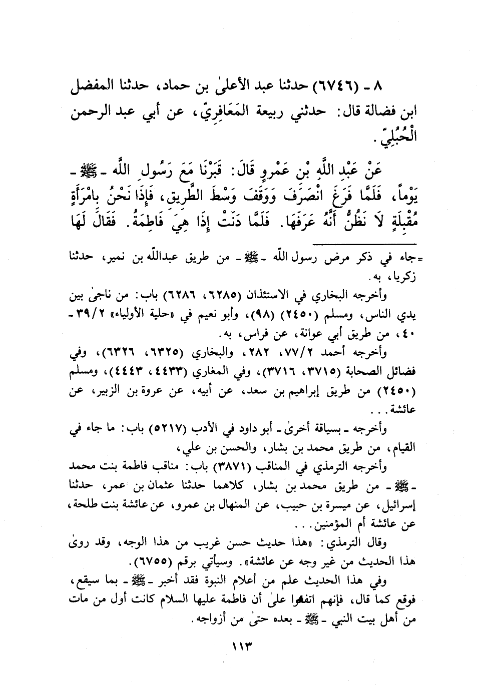 6746 - حَدَّثَنَا عَبْدُ الْأَعْلَى بْنُ حَمَّادٍ، حَدَّثَنَا الْمُفَضَّلُ بْنُ فَضَالَةَ قَالَ: حَدَّثَنِي رَبِيعَةُ الْمَعَافِرِيُّ، عَنْ أَبِي عَبْدِ الرَّحْمَنِ الْحُبُلِيِّ، عَنْ عَبْدِ اللَّهِ بْنِ عَمْرٍو قَالَ: قَبَرْنَا مَعَ رَسُولِ اللَّهِ صَلَّى اللهُ عَلَيْهِ وَسَلَّمَ يَوْمًا فَلَمَّا فَرَغَ انْصَرَفَ وَوَقَفَ وَسْطَ الطَّرِيقِ، فَإِذَا نَحْنُ بِامْرَأَةٍ مُقْبِلَةٍ لَا نَظُنُّ أَنَّهُ عَرَفَهَا. فَلَمَّا دَنَتْ، إِذَا هِيَ فَاطِمَةُ، فَقَالَ لَهَا -[114]- رَسُولُ اللَّهِ صَلَّى اللهُ عَلَيْهِ وَسَلَّمَ: «يَا فَاطِمَةُ، §مَا أَخْرَجَكِ مِنْ بَيْتِكِ؟». قَالَتْ: أَتَيْتُ يَا رَسُولَ اللَّهِ أَهْلَ هَذَا الْبَيْتِ فَرَحِمْتُ إِلَيْهِمْ مَيِّتَهُمْ - أَوْ عَزَّيْتُهُمْ لَا أَحْفَظُ أَيَّ ذَلِكَ قَالَتْ - قَالَ رَبِيعَةُ: فَقَالَ رَسُولُ اللَّهِ صَلَّى اللهُ عَلَيْهِ وَسَلَّمَ: «لَعَلَّكِ بَلَّغْتِ مَعَهُمُ الْكُدَى؟». قَالَتْ: مَعَاذَ اللَّهِ وَقَدْ سَمِعْتُكَ تَذْكُرُ فِيهَا مَا تَذْكُرُ قَالَ: «لَوْ بَلَغْتِ الْكُدَى مَا رَأَيْتِ الْجَنَّةَ حَتَّى يَرَاهَا جَدُّكِ أَبُو أُمُّكِ، أَوْ أَبُو أَبِيكِ»، شَكَّ أَبُو يَحْيَى. فَسَأَلْتُ رَبِيعَةَ عَنِ الْكُدَى، فَقَالَ: أَحْسَبُهَا الْمَقَابِرَ - قَالَ: فَلَمَّا رَأَيْتُ رَبِيعَةَ شَكَّ لَقِيتُ يَزِيدَ بْنَ أَبِي حَبِيبٍ، فَأَخْبَرْتُهُ بِحَدِيثِ رَبِيعَةَ وَسَأَلْتُهُ الْكُدَى، فَقَالَ: هِيَ الْمَقَابِرُKإسناده ضعيف