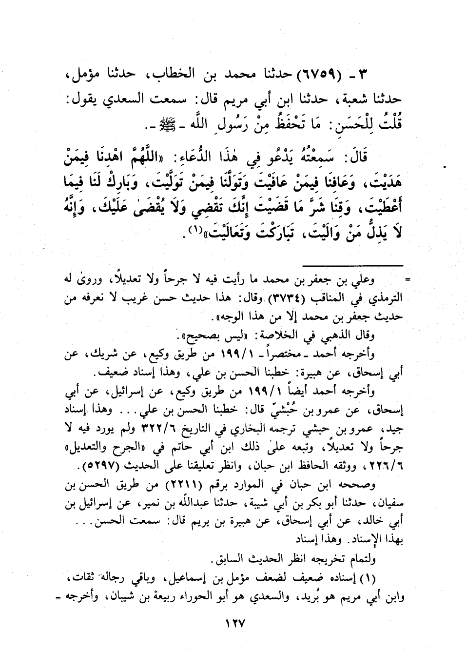 6759 - حَدَّثَنَا مُحَمَّدُ بْنُ الْخَطَّابِ، حَدَّثَنَا مُؤَمَّلٌ، حَدَّثَنَا شُعْبَةُ، حَدَّثَنَا ابْنُ أَبِي مَرْيَمَ قَالَ: سَمِعْتُ السَّعْدِيَّ يَقُولُ: قُلْتُ لِلْحَسَنِ: مَا تَحْفَظُ مِنْ رَسُولِ اللَّهِ صَلَّى اللهُ عَلَيْهِ وَسَلَّمَ؟ قَالَ: سَمِعَتْهُ يَدْعُو فِي هَذَا الدُّعَاءِ: «§اللَّهُمَّ اهْدِنَا فِيمَنْ هَدَيْتَ، وَعَافِنَا فِيمَنْ عَافَيْتَ، وَتَوَلَّنَا فِيمَنْ تَوَلَّيْتَ، وَبَارِكْ لَنَا فِيمَا أَعْطَيْتَ، وَقِنَا شَرَّ مَا قَضَيْتَ، إِنَّكَ تَقْضِي وَلَا يُقْضَى عَلَيْكَ، وَإِنَّهُ لَا يَذِلُّ مَنْ وَالَيْتَ، تَبَارَكْتَ وَتَعَالَيْتَ» Kإسناده ضعيف