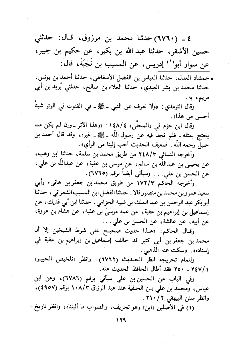 6760 - حَدَّثَنَا مُحَمَّدُ بْنُ مَرْزُوقٍ قَالَ: حَدَّثَنِي حُسَيْنٌ الْأَشْقَرُ، حَدَّثَنَا عَبْدُ اللَّهِ بْنُ بُكَيْرٍ، عَنْ حَكِيمِ بْنِ جُبَيْرٍ، عَنْ سَوَّارٍ أَبِي إِدْرِيسَ، عَنِ الْمُسَيَّبِ بْنِ نَجَبَةَ قَالَ -[130]-: دَخَلْتُ عَلَى الْحَسَنِ بْنِ عَلِيٍّ، فَقَالَ: قَالَ رَسُولُ اللَّهِ صَلَّى اللهُ عَلَيْهِ وَسَلَّمَ: «§الْحَرْبُ خَدْعَةٌ» Kإسناده ضعيف