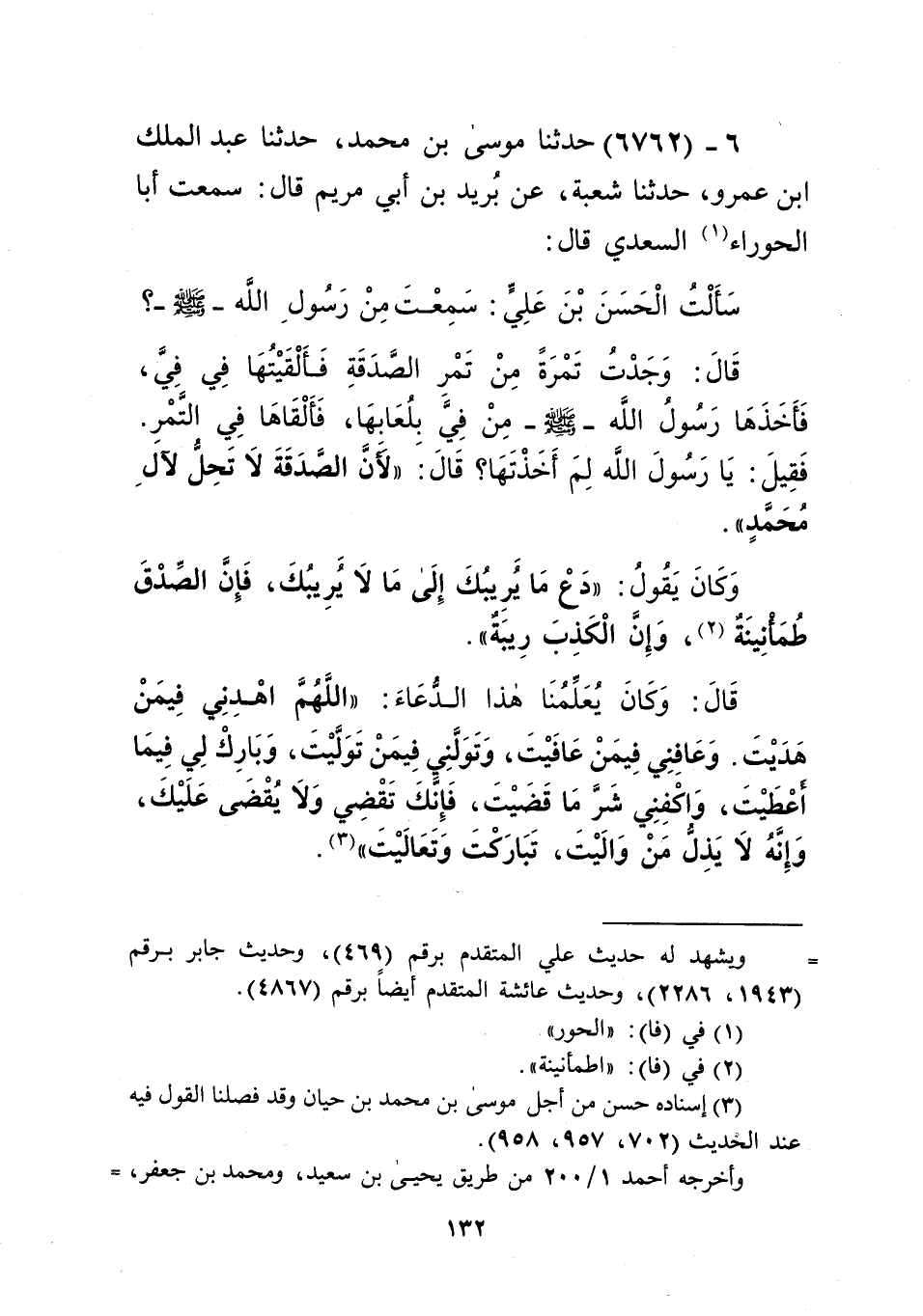 6762 - حَدَّثَنَا مُوسَى بْنُ مُحَمَّدٍ، حَدَّثَنَا عَبْدُ الْمَلِكِ بْنِ عَمْرٍو، حَدَّثَنَا شُعْبَةُ، عَنْ بُرَيْدِ بْنِ أَبِي مَرْيَمَ قَالَ: سَمِعْتُ أَبَا الْحَوْرَاءِ السَّعْدِيَّ قَالَ: سَأَلْتُ الْحَسَنَ بْنَ عَلِيٍّ: سَمِعْتَ مِنْ رَسُولِ اللَّهِ صَلَّى اللهُ عَلَيْهِ وَسَلَّمَ قَالَ: وَجَدْتُ تَمْرَةً مِنْ تَمْرِ الصَّدَقَةِ، فَأَلْقَيْتُهَا فِي فِيَّ، فَأَخَذَهَا رَسُولُ اللَّهِ صَلَّى اللهُ عَلَيْهِ وَسَلَّمَ مِنْ فِيَّ بِلُعَابِهَا، فَأَلْقَاهَا فِي التَّمْرِ، فَقِيلَ: يَا رَسُولَ اللَّهِ، لِمَ أَخَذْتَهَا؟ قَالَ: «لَأَنَّ §الصَّدَقَةَ لَا تَحِلُّ لِآلِ مُحَمَّدٍ»، وَكَانَ يَقُولُ: «دَعْ مَا يَرِيبُكَ إِلَى مَا لَا يَرِيبُكَ، فَإِنَّ الصِّدْقَ طُمَأْنِينَةٌ، وَإِنَّ الْكَذِبَ رِيبَةٌ» قَالَ: وَكَانَ يُعَلِّمُنَا هَذَا الدُّعَاءَ: «اللَّهُمَّ اهْدِنِي فِيمَنْ هَدَيْتَ، وَعَافِنِي فِيمَنْ عَافَيْتَ، وَتَوَلَّنِي فِيمَنْ تَوَلَّيْتَ، وَبَارِكْ لِي فِيمَا أَعْطَيْتَ، وَاكْفِنِي شَرَّ مَا قَضَيْتَ، فَإِنَّكَ تَقْضِي وَلَا يُقْضَى عَلَيْكَ، وَإِنَّهُ لَا يَذِلُّ مَنْ وَالَيْتَ، تَبَارَكْتَ وَتَعَالَيْتَ» Kإسناده حسن