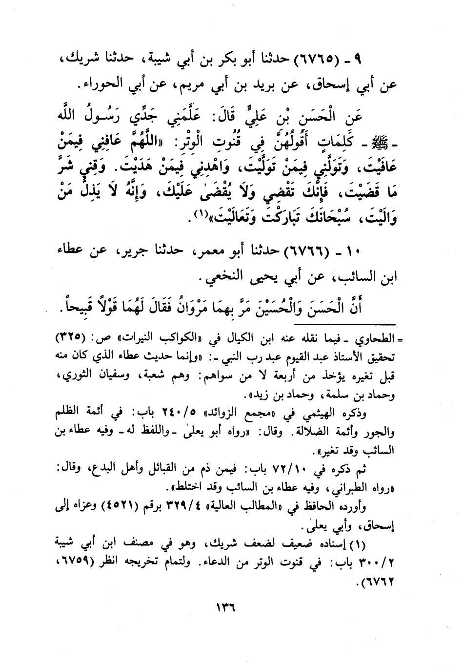 6765 - حَدَّثَنَا أَبُو بَكْرِ بْنُ أَبِي شَيْبَةَ، حَدَّثَنَا شَرِيكٌ، عَنْ أَبِي إِسْحَاقَ، عَنْ بُرَيْدِ بْنِ أَبِي مَرْيَمَ، عَنْ أَبِي الْحَوْرَاءِ، عَنِ الْحَسَنِ بْنِ عَلِيٍّ قَالَ: عَلَّمَنِي جَدِّي رَسُولُ اللَّهِ صَلَّى اللهُ عَلَيْهِ وَسَلَّمَ كَلِمَاتٍ أَقُولُهُنَّ فِي قُنُوتِ الْوِتْرِ: «§اللَّهُمَّ عَافِنِي فِيمَنْ عَافَيْتَ، وَتَوَلَّنِي فِيمَنْ تَوَلَّيْتَ، وَاهْدِنِي فِيمَنْ هَدَيْتَ، وَقِنِي شَرَّ مَا قَضَيْتَ، فَإِنَّكَ تَقْضِي وَلَا يُقْضَى عَلَيْكَ، وَإِنَّهُ لَا يَذِلُّ مَنْ وَالَيْتَ، سُبْحَانَكَ تَبَارَكْتَ وَتَعَالَيْتَ» Kإسناده ضعيف