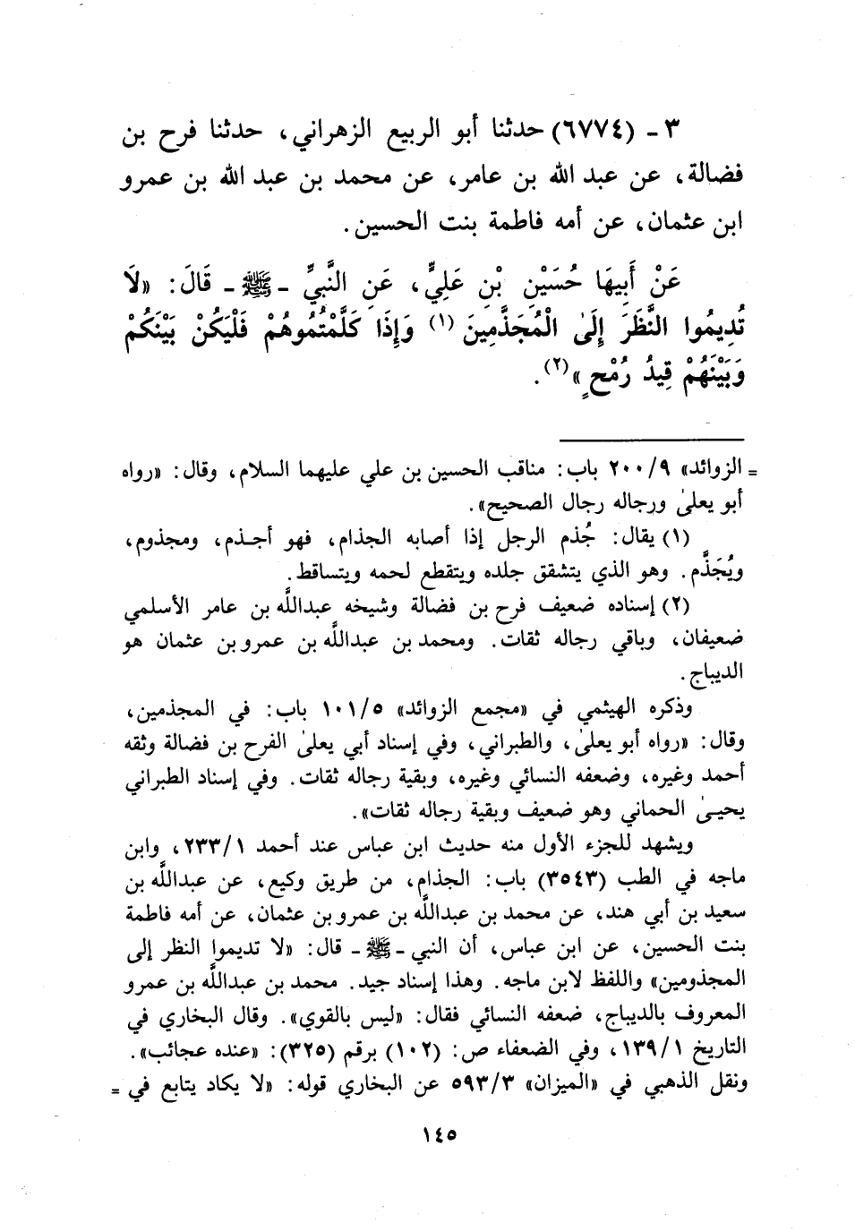 6774 - حَدَّثَنَا أَبُو الرَّبِيعِ الزَّهْرَانِيُّ، حَدَّثَنَا فَرَجُ بْنُ فَضَالَةَ، عَنْ عَبْدِ اللَّهِ بْنِ عَامِرٍ، عَنْ مُحَمَّدِ بْنِ عَبْدِ اللَّهِ بْنِ عَمْرِو بْنِ عُثْمَانَ، عَنْ أُمِّهِ فَاطِمَةَ بِنْتِ الْحُسَيْنِ، عَنْ أَبِيهَا حُسَيْنِ بْنِ عَلِيٍّ، عَنِ النَّبِيِّ صَلَّى اللهُ عَلَيْهِ وَسَلَّمَ قَالَ: «§لَا تُدِيمُوا النَّظَرَ إِلَى الْمُجَذَّمِينَ، وَإِذَا كَلَّمْتُمُوهُمْ فَلْيَكُنْ بَيْنَكُمْ وَبَيْنَهُمْ قِيدُ رُمْحٍ» Kإسناده ضعيف