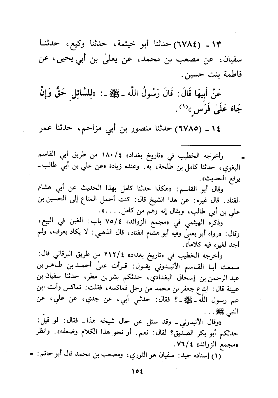 6784 - حَدَّثَنَا أَبُو خَيْثَمَةَ، حَدَّثَنَا وَكِيعٌ، حَدَّثَنَا سُفْيَانُ، عَنْ مُصْعَبِ بْنِ مُحَمَّدٍ، عَنْ يَعْلَى بْنِ أَبِي يَحْيَى، عَنْ فَاطِمَةَ بِنْتِ حُسَيْنٍ، عَنْ أَبِيهَا، قَالَ: قَالَ رَسُولُ اللَّهِ صَلَّى اللهُ عَلَيْهِ وَسَلَّمَ: «§لِلسَّائِلِ حَقٌّ، وَإِنْ جَاءَ عَلَى فَرَسٍ» Kإسناده جيد