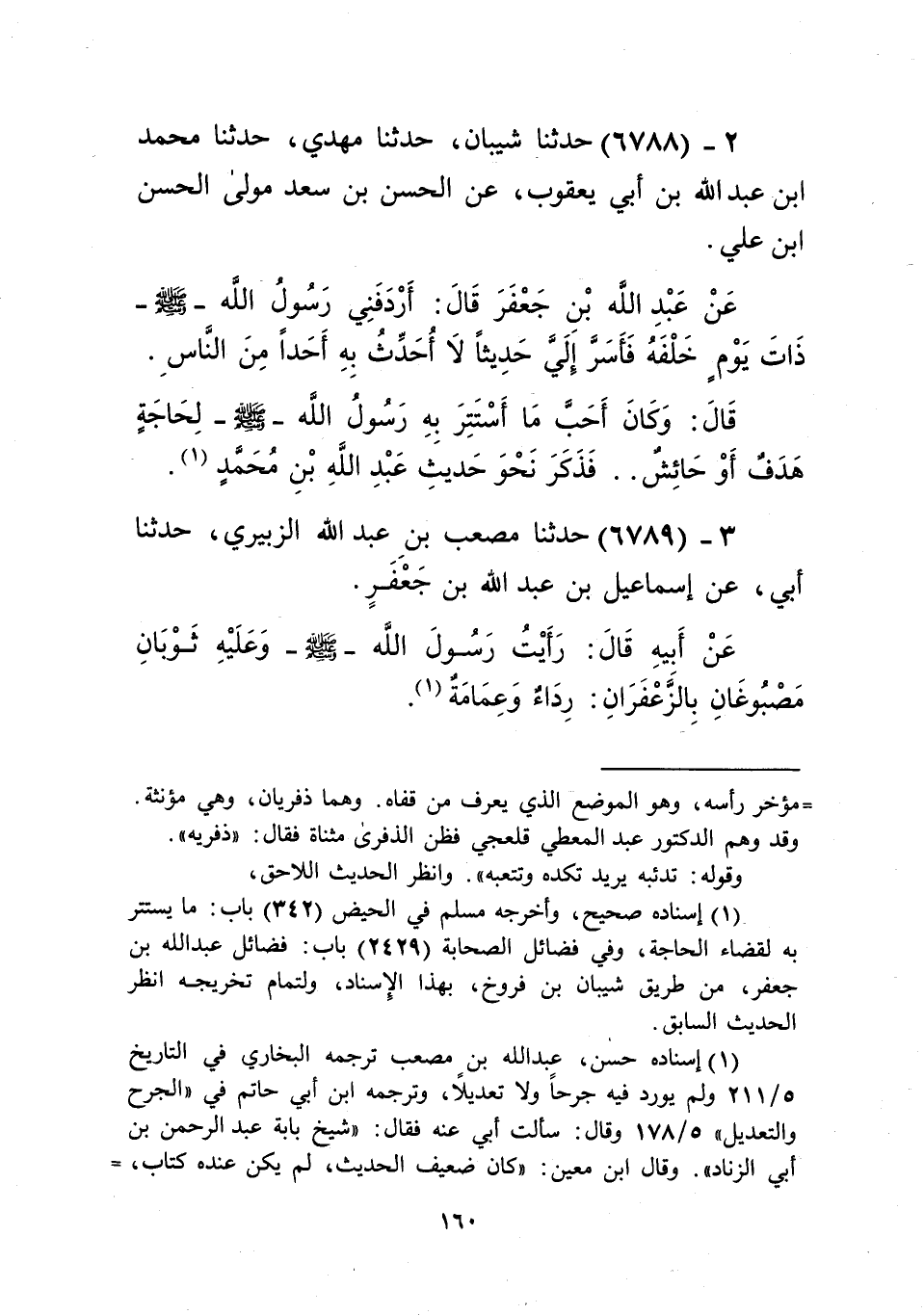 6789 - حَدَّثَنَا مُصْعَبُ بْنُ عَبْدِ اللَّهِ الزُّبَيْرِيُّ، حَدَّثَنَا أَبِي، عَنْ إِسْمَاعِيلَ بْنِ عَبْدِ اللَّهِ بْنِ جَعْفَرٍ، عَنْ أَبِيهِ، قَالَ: رَأَيْتُ رَسُولَ اللَّهِ صَلَّى اللهُ عَلَيْهِ وَسَلَّمَ " §وَعَلَيْهِ ثَوْبَانِ مَصْبُوغَانِ بِالزَّعْفَرَانِ: رِدَاءٌ، وَعِمَامَةٌ "Kإسناده حسن