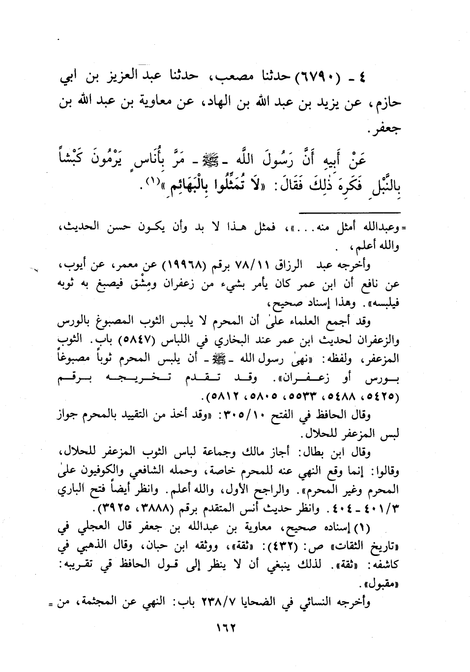 6790 - حَدَّثَنَا مُصْعَبٌ، حَدَّثَنَا عَبْدُ الْعَزِيزِ بْنِ أَبِي حَازِمٍ، عَنْ يَزِيدَ بْنِ عَبْدِ اللَّهِ بْنِ الْهَادِ، عَنْ مُعَاوِيَةَ بْنِ عَبْدِ اللَّهِ بْنِ جَعْفَرٍ، عَنْ أَبِيهِ، أَنَّ رَسُولَ اللَّهِ صَلَّى اللهُ عَلَيْهِ وَسَلَّمَ مَرَّ بِأُنَاسٍ يَرْمُونَ كَبْشًا بِالنَّبْلِ فَكَرِهَ ذَلِكَ فَقَالَ: «§لَا تُمَثِّلُوا بِالْبَهَائِمِ» Kإسناده صحيح