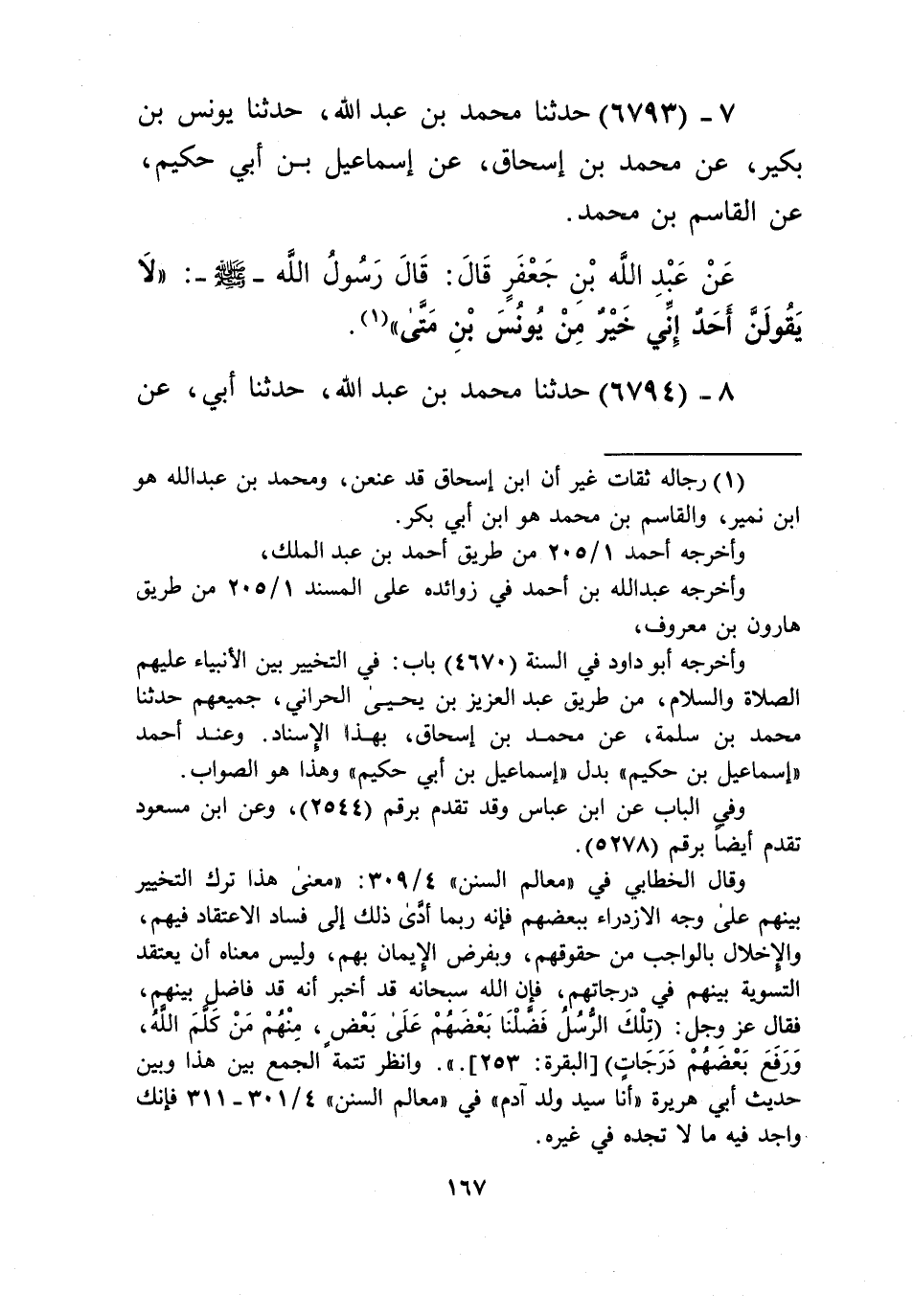 6793 - حَدَّثَنَا مُحَمَّدُ بْنُ عَبْدِ اللَّهِ، حَدَّثَنَا يُونُسُ بْنُ بُكَيْرٍ، عَنْ مُحَمَّدِ بْنِ إِسْحَاقَ، عَنْ إِسْمَاعِيلَ بْنِ أَبِي حَكِيمٍ، عَنِ الْقَاسِمِ بْنِ مُحَمَّدٍ، عَنْ عَبْدِ اللَّهِ بْنِ جَعْفَرٍ قَالَ: قَالَ رَسُولُ اللَّهِ صَلَّى اللهُ عَلَيْهِ وَسَلَّمَ: «§لَا يَقُولَنَّ أَحَدٌ إِنِّي خَيْرٌ مِنْ يُونُسَ بْنِ مَتَّى» Kرجاله ثقات