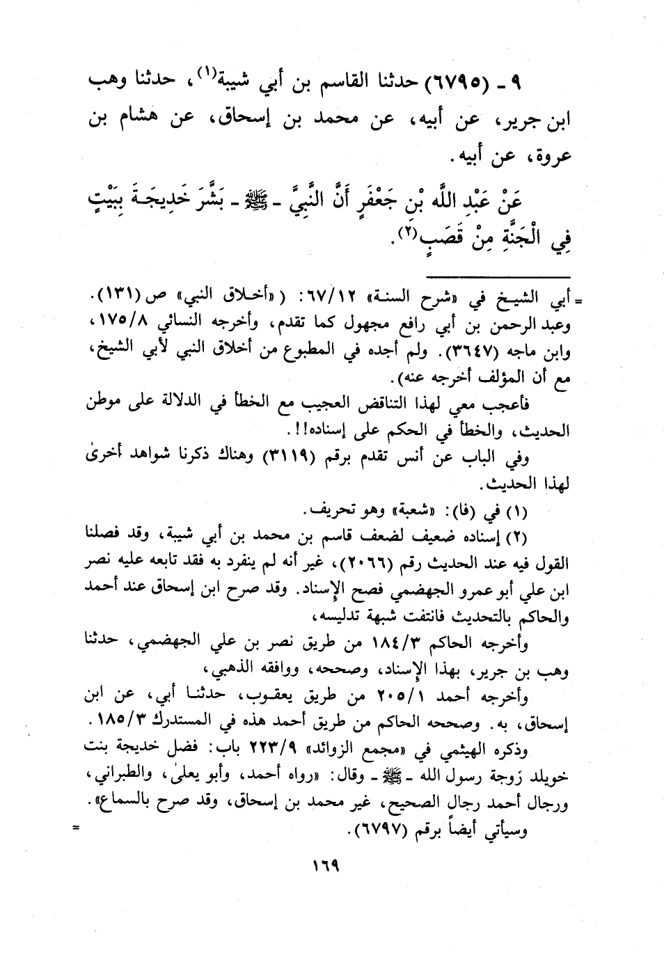 6795 - حَدَّثَنَا الْقَاسِمُ بْنُ أَبِي شَيْبَةَ، حَدَّثَنَا وَهْبُ بْنُ جَرِيرٍ، عَنْ أَبِيهِ، عَنْ مُحَمَّدِ بْنِ إِسْحَاقَ، عَنْ هِشَامِ بْنِ عُرْوَةَ، عَنْ أَبِيهِ، عَنْ عَبْدِ اللَّهِ بْنِ جَعْفَرٍ، أَنَّ النَّبِيَّ صَلَّى اللهُ عَلَيْهِ وَسَلَّمَ «§بَشَّرَ خَدِيجَةَ بِبَيْتٍ فِي الْجَنَّةِ مِنْ قَصَبٍ» Kإسناده ضعيف