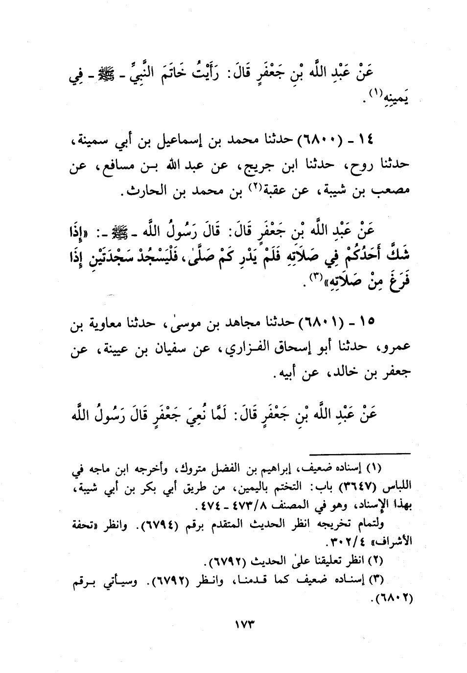6800 - حَدَّثَنَا مُحَمَّدُ بْنُ إِسْمَاعِيلَ بْنِ أَبِي سَمِينَةَ، حَدَّثَنَا رَوْحٌ، حَدَّثَنَا ابْنُ جُرَيْجٍ، عَنْ عَبْدِ اللَّهِ بْنِ مُسَافِعٍ، عَنْ مُصْعَبِ بْنِ شَيْبَةَ، عَنْ عُقْبَةَ بْنِ مُحَمَّدِ بْنِ الْحَارِثِ، عَنْ عَبْدِ اللَّهِ بْنِ جَعْفَرٍ قَالَ: قَالَ رَسُولُ اللَّهِ صَلَّى اللهُ عَلَيْهِ وَسَلَّمَ: «§إِذَا شَكَّ أَحَدُكُمْ فِي صَلَاتِهِ فَلَمْ يَدْرِ كَمْ صَلَّى، فَلْيَسْجُدْ سَجْدَتَيْنِ إِذَا فَرَغَ مِنْ صَلَاتِهِ» Kإسناده ضعيف