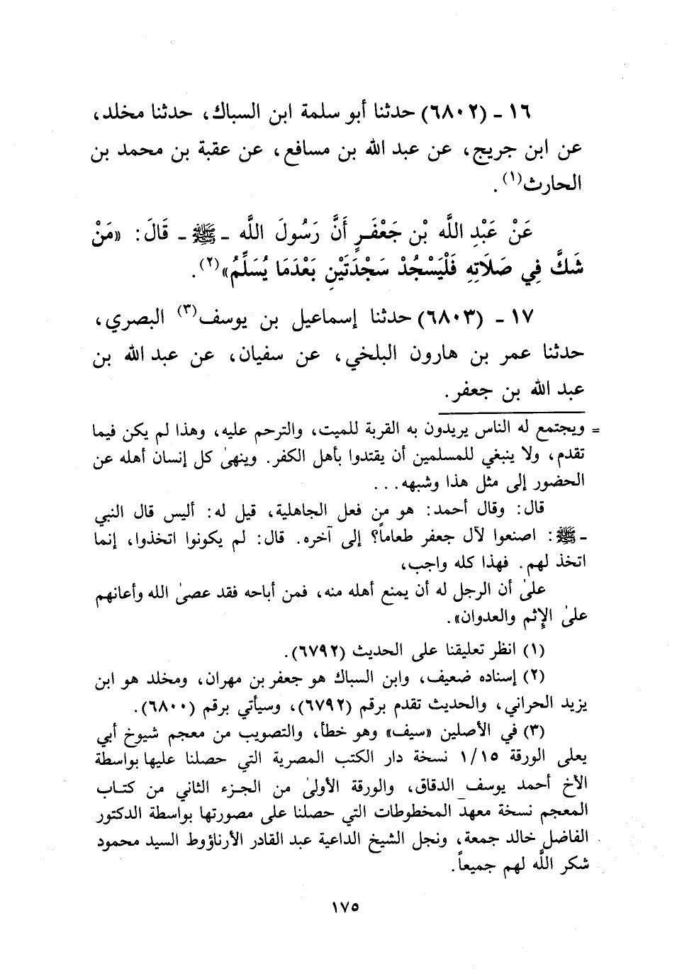 6802 - حَدَّثَنَا أَبُو سَلَمَةَ بْنُ السَّبَّاكِّ، حَدَّثَنَا مَخْلَدٌ، عَنِ ابْنِ جُرَيْجٍ، عَنْ عَبْدِ اللَّهِ بْنِ مُسَافِعٍ، عَنْ عُقْبَةَ بْنِ مُحَمَّدِ بْنِ الْحَارِثِ، عَنْ عَبْدِ اللَّهِ بْنِ جَعْفَرٍ، أَنَّ رَسُولَ اللَّهِ صَلَّى اللهُ عَلَيْهِ وَسَلَّمَ قَالَ: «§مَنْ شَكَّ فِي صَلَاتِهِ فَلْيَسْجُدْ سَجْدَتَيْنِ بَعْدَمَا يُسَلِّمُ» Kإسناده ضعيف