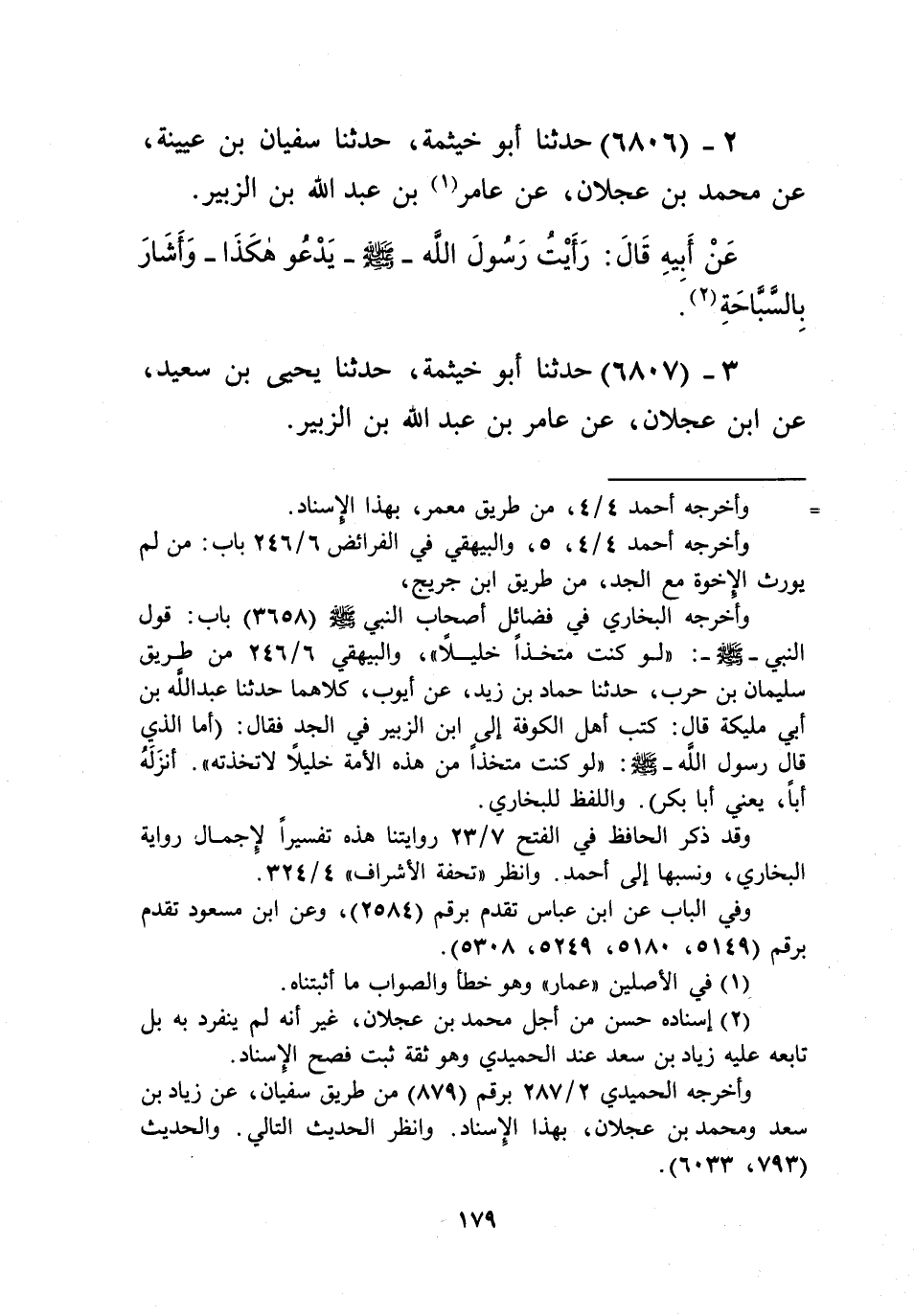 6806 - حَدَّثَنَا أَبُو خَيْثَمَةَ، حَدَّثَنَا سُفْيَانُ بْنُ عُيَيْنَةَ، عَنْ مُحَمَّدِ بْنِ عَجْلَانَ، عَنْ عَامِرِ بْنِ عَبْدِ اللَّهِ بْنِ الزُّبَيْرِ، عَنْ أَبِيهِ، قَالَ: رَأَيْتُ رَسُولَ اللَّهِ صَلَّى اللهُ عَلَيْهِ وَسَلَّمَ «§يَدْعُو هَكَذَا - وَأَشَارَ بِالسَّبَّاحَةِ» Kإسناده حسن