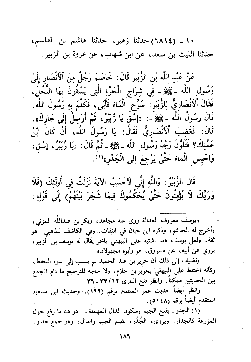 6814 - حَدَّثَنَا زُهَيْرٌ، حَدَّثَنَا هَاشِمُ بْنُ الْقَاسِمِ، حَدَّثَنَا اللَّيْثُ بْنُ سَعْدٍ، عَنِ ابْنِ شِهَابٍ، عَنْ عُرْوَةَ بْنِ الزُّبَيْرِ، عَنْ عَبْدِ اللَّهِ بْنِ الزُّبَيْرِ قَالَ: خَاصَمَ رَجُلٌ مِنَ الْأَنْصَارِ إِلَى رَسُولِ اللَّهِ صَلَّى اللهُ عَلَيْهِ وَسَلَّمَ فِي شِرَاجِ الْحَرَّةِ الَّتِي يَسْقُونَ بِهَا النَّخْلَ، فَقَالَ الْأَنْصَارِيُّ لِلزُّبَيْرِ: سَرِّحِ الْمَاءَ فَأَبَى، فَكَلَّمَ بِهِ رَسُولَ اللَّهِ، قَالَ رَسُولُ اللَّهِ صَلَّى اللهُ عَلَيْهِ وَسَلَّمَ: «§اسْقِ يَا زُبَيْرُ، ثُمَّ أَرْسِلْ إِلَى جَارِكَ». قَالَ: فَغَضِبَ الْأَنْصَارِيُّ، فَقَالَ: يَا رَسُولَ اللَّهِ، أَنْ كَانَ ابْنَ عَمَّتِكَ؟ فَتَلَوَّنَ وَجْهُ رَسُولِ اللَّهِ صَلَّى اللهُ عَلَيْهِ وَسَلَّمَ، ثُمَّ قَالَ: «يَا زُبَيْرُ، اسْقِ، وَاحْبِسِ الْمَاءَ حَتَّى يَرْجِعَ إِلَى الْجَدْرِ». قَالَ الزُّبَيْرُ: وَاللَّهِ إِنِّي لَأَحْسَبُ الْآيَةَ نَزَلَتْ فِي أُولَئِكَ {فَلَا وَرَبِّكَ لَا يُؤْمِنُونَ حَتَّى يُحَكِّمُوكَ فِيمَا شَجَرَ بَيْنَهُمْ} [النساء: 65]- إِلَى قَوْلِهِ -[190]-: - {وَيُسَلِّمُوا تَسْلِيمًا} [النساء: 65] Kإسناده صحيح
