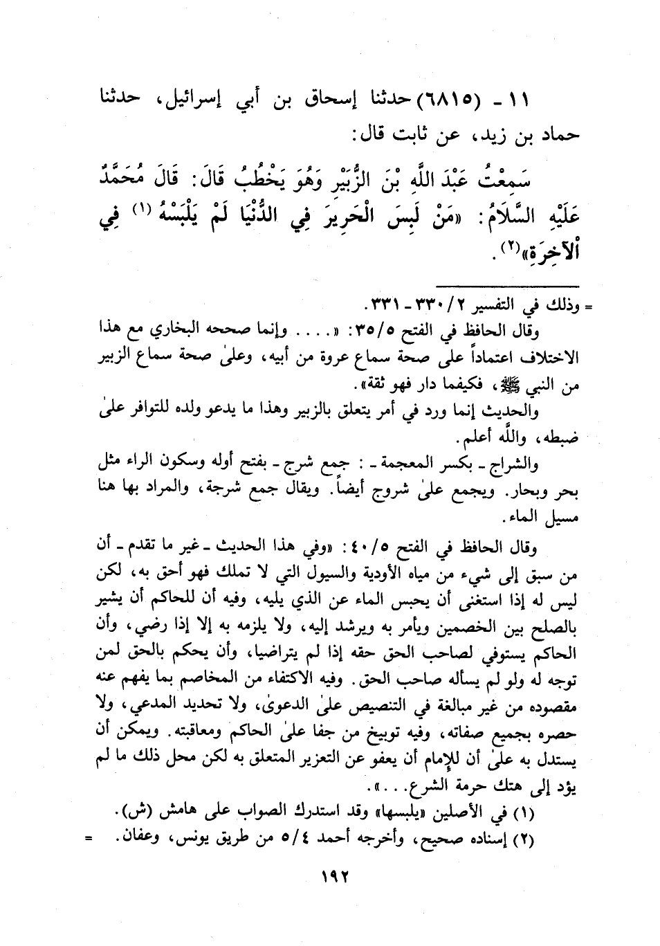 6815 - حَدَّثَنَا إِسْحَاقُ بْنُ أَبِي إِسْرَائِيلَ، حَدَّثَنَا حَمَّادُ بْنُ زَيْدٍ، عَنْ ثَابِتٍ قَالَ: سَمِعْتُ عَبْدَ اللَّهِ بْنَ الزُّبَيْرِ وَهُوَ يَخْطُبُ قَالَ: قَالَ مُحَمَّدٌ عَلَيْهِ السَّلَامُ: «§مَنْ لَبِسَ الْحَرِيرَ فِي الدُّنْيَا لَمْ يَلْبَسْهُ فِي الْآخِرَةَ» Kإسناده صحيح