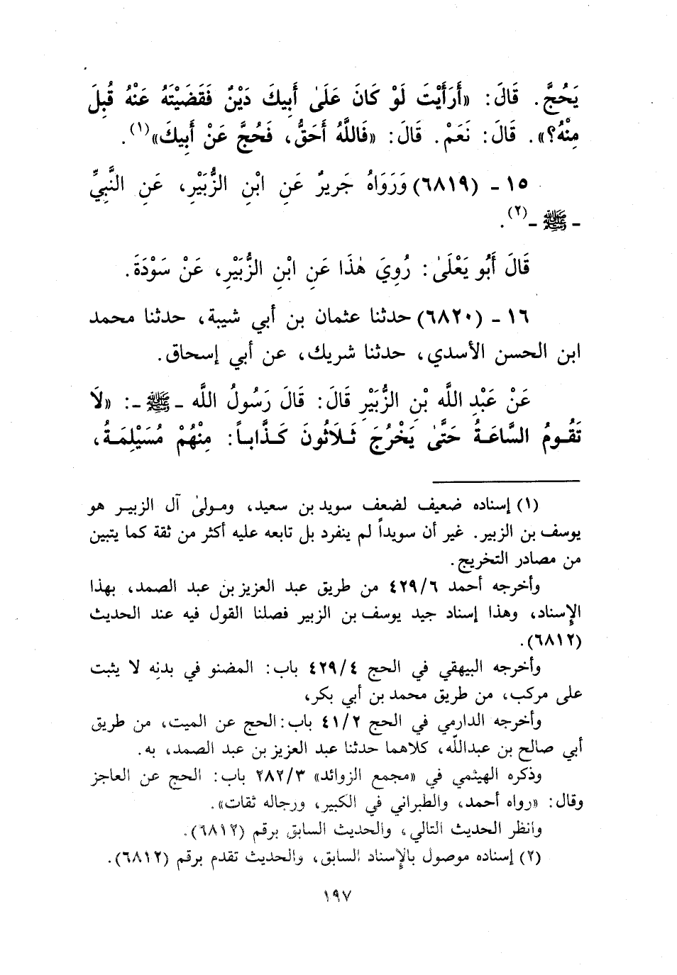 6820 - حَدَّثَنَا عُثْمَانُ بْنُ أَبِي شَيْبَةَ، حَدَّثَنَا مُحَمَّدُ بْنُ الْحَسَنِ الْأَسَدِيُّ، حَدَّثَنَا شَرِيكٌ، عَنْ أَبِي إِسْحَاقَ، عَنْ عَبْدِ اللَّهِ بْنِ الزُّبَيْرِ قَالَ: قَالَ رَسُولُ اللَّهِ صَلَّى اللهُ عَلَيْهِ وَسَلَّمَ: " §لَا تَقُومُ السَّاعَةُ حَتَّى يَخْرُجَ ثَلَاثُونَ كَذَّابًا: مِنْهُمْ مُسَيْلِمَةُ، وَالْعَنْسِيُّ، وَالْمُخْتَارُ، وَشَرُّ قَبَائِلِ الْعَرَبِ بَنُو أُمَيَّةَ، وَبَنُو حَنِيفَةَ، وَثَقِيفٌ "Kإسناده ضعيف