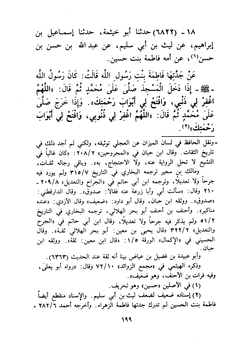 6822 - حَدَّثَنَا أَبُو خَيْثَمَةَ، حَدَّثَنَا إِسْمَاعِيلُ بْنُ إِبْرَاهِيمَ، عَنْ لَيْثِ بْنِ أَبِي سُلَيْمٍ، عَنْ عَبْدِ اللَّهِ بْنِ حَسَنِ بْنِ حَسَنٍ، عَنْ أُمَّهِ فَاطِمَةَ بِنْتِ حُسَيْنٍ، عَنْ جَدَّتِهَا فَاطِمَةَ بِنْتِ رَسُولِ اللَّهِ، قَالَتْ: كَانَ رَسُولُ اللَّهِ صَلَّى اللهُ عَلَيْهِ وَسَلَّمَ §إِذَا دَخَلَ الْمَسْجِدَ صَلَّى عَلَى مُحَمَّدٍ، ثُمَّ قَالَ: «اللَّهُمَّ اغْفِرْ لِي ذَنْبِي، وَافْتَحْ لِي أَبْوَابَ رَحْمَتِكَ». وَإِذَا خَرَجَ صَلَّى عَلَى مُحَمَّدٍ، ثُمَّ قَالَ: «اللَّهُمَّ اغْفِرْ لِي ذُنُوبِي، وَافْتَحْ لِي أَبْوَابَ رَحْمَتِكَ» -[200]-.Kإسناده ضعيف