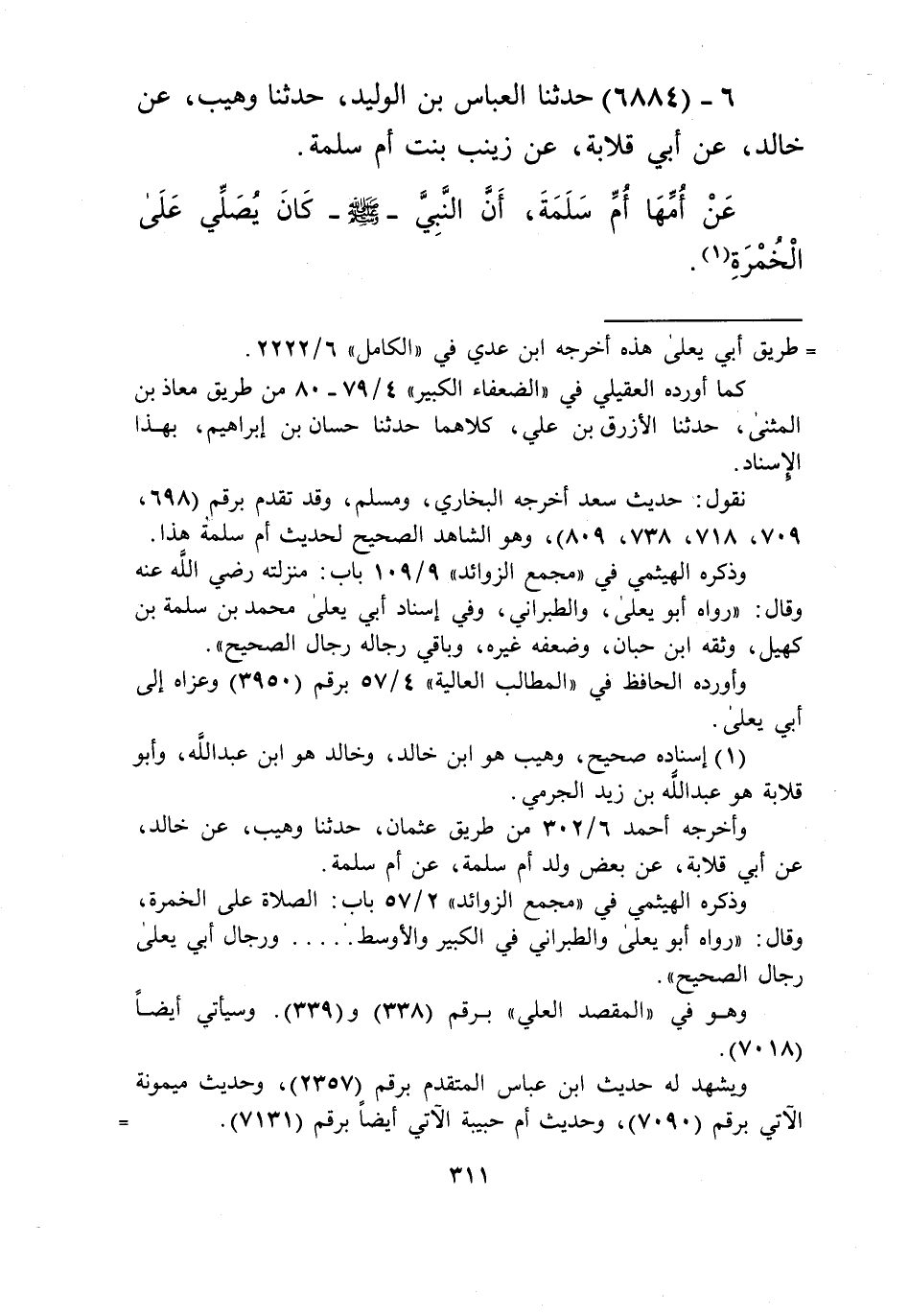 6884 - حَدَّثَنَا الْعَبَّاسُ بْنُ الْوَلِيدِ، حَدَّثَنَا وُهَيْبٌ، عَنْ خَالِدٍ، عَنْ أَبِي قِلَابَةَ، عَنْ زَيْنَبَ بِنْتِ أُمِّ سَلَمَةَ، عَنْ أُمِّهَا أُمِّ سَلَمَةَ، أَنَّ النَّبِيَّ صَلَّى اللهُ عَلَيْهِ وَسَلَّمَ «كَانَ §يُصَلِّي عَلَى الْخُمْرَةِ» Kإسناده صحيح