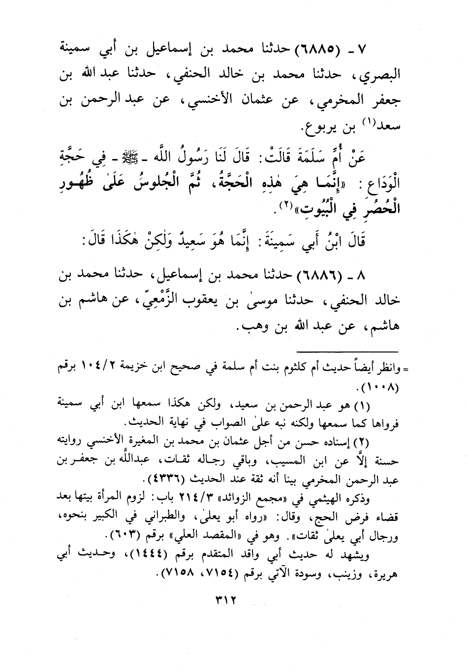 6885 - حَدَّثَنَا مُحَمَّدُ بْنُ إِسْمَاعِيلَ بْنِ أَبِي سَمِينَةَ الْبَصْرِيُّ، حَدَّثَنَا مُحَمَّدُ بْنُ خَالِدٍ الْحَنَفِيُّ، حَدَّثَنَا عَبْدُ اللَّهِ بْنُ جَعْفَرٍ الْمَخْرَمِيُّ، عَنْ عُثْمَانَ الْأَخْنَسِيِّ، عَنْ عَبْدِ الرَّحْمَنِ بْنِ سَعْدِ بْنِ يَرْبُوعٍ، عَنْ أُمِّ سَلَمَةَ، قَالَتْ: قَالَ لَنَا رَسُولُ اللَّهِ صَلَّى اللهُ عَلَيْهِ وَسَلَّمَ فِي حَجَّةِ الْوَدَاعِ: «§إِنَّمَا هِيَ هَذِهِ الْحَجَّةُ، ثُمَّ الْجُلُوسُ عَلَى ظُهُورِ الْحُصُرِ فِي الْبُيُوتِ» قَالَ ابْنُ أَبِي سَمِينَةَ: «إِنَّمَا هُوَ سَعِيدٌ وَلَكِنْ هَكَذَا قَالَ» Kإسناده حسن