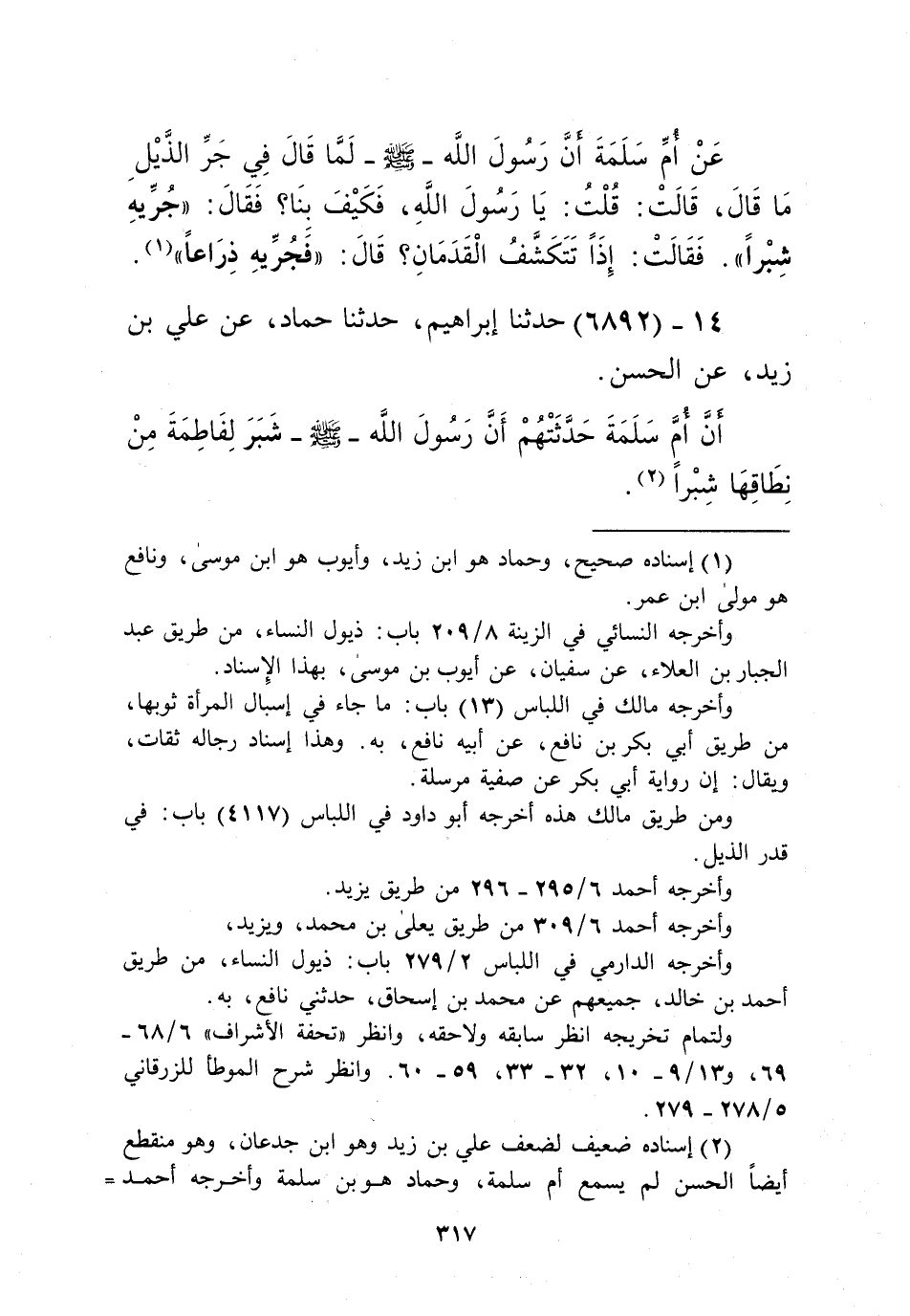 6892 - حَدَّثَنَا إِبْرَاهِيمُ، حَدَّثَنَا حَمَّادٌ، عَنْ عَلِيِّ بْنِ زَيْدٍ، عَنِ الْحَسَنِ، أَنَّ أُمَّ سَلَمَةَ حَدَّثَتْهُمْ أَنَّ رَسُولَ اللَّهِ صَلَّى اللهُ عَلَيْهِ وَسَلَّمَ «§شَبَرَ لِفَاطِمَةَ مِنْ نِطَاقِهَا شِبْرًا» Kإسناده ضعيف