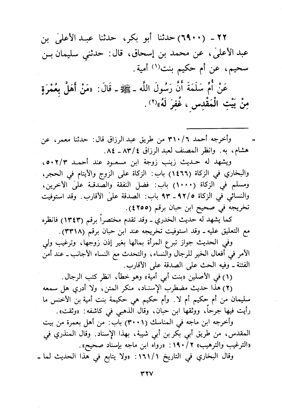 6900 - حَدَّثَنَا أَبُو بَكْرٍ، حَدَّثَنَا عَبْدُ الْأَعْلَى بْنُ عَبْدِ الْأَعْلَى، عَنْ مُحَمَّدِ بْنِ إِسْحَاقَ قَالَ: حَدَّثَنِي سُلَيْمَانُ بْنُ سُحَيْمٍ، عَنْ أُمِّ حَكِيمٍ بِنْتِ أُمَيَّةَ، عَنْ أُمِّ سَلَمَةَ، أَنَّ رَسُولَ اللَّهِ صَلَّى اللهُ عَلَيْهِ وَسَلَّمَ قَالَ: «§مَنْ أَهَلَّ بِعُمْرَةٍ مِنْ بَيْتِ الْمَقْدِسِ، غُفِرَ لَهُ» Kهذا حديث مضطرب الإسناد منكر المتن