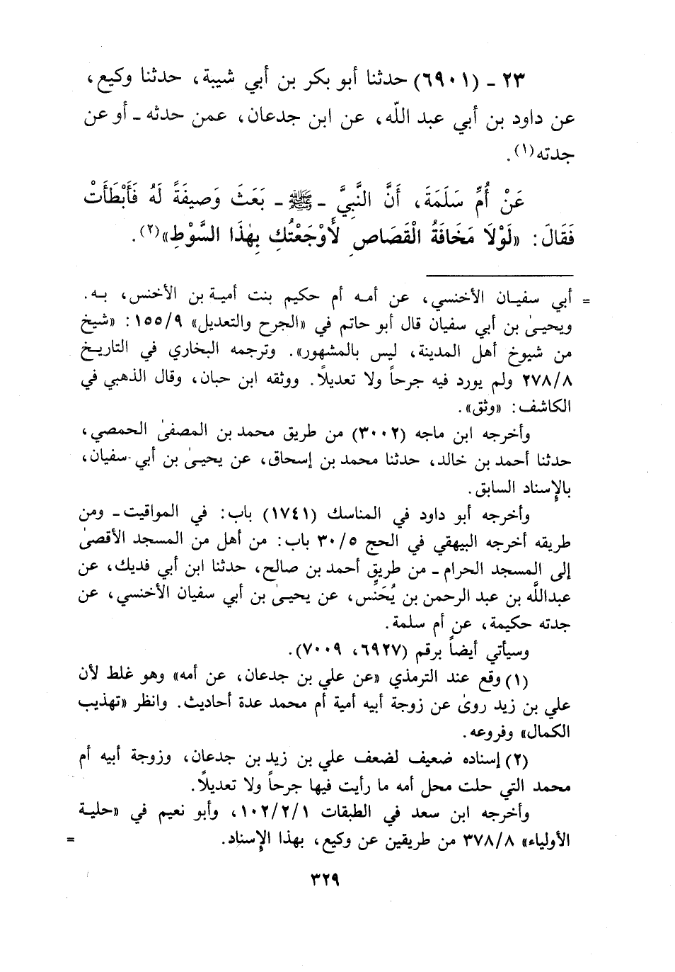 6901 - حَدَّثَنَا أَبُو بَكْرِ بْنُ أَبِي شَيْبَةَ، حَدَّثَنَا وَكِيعٌ، عَنْ دَاوُدَ بْنِ أَبِي عَبْدِ اللَّهِ، عَنِ ابْنِ جُدْعَانَ، عَمَّنْ، حَدَّثَهُ، أَوْ عَنْ جَدَّتِهِ، عَنْ أُمِّ سَلَمَةَ، أَنَّ النَّبِيَّ صَلَّى اللهُ عَلَيْهِ وَسَلَّمَ بَعَثَ وَصِيفَةً لَهُ فَأَبْطَأَتْ، فَقَالَ: «§لَوْلَا مَخَافَةُ الْقِصَاصِ لَأَوْجَعْتُكِ بِهَذَا السَّوْطِ» Kإسناده ضعيف