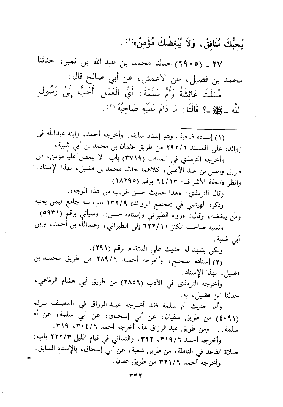 6905 - حَدَّثَنَا مُحَمَّدُ بْنُ عَبْدِ اللَّهِ بْنِ نُمَيْرٍ، حَدَّثَنَا مُحَمَّدُ بْنُ فُضَيْلٍ، عَنِ الْأَعْمَشِ، عَنْ أَبِي صَالِحٍ قَالَ: سُئِلَتْ عَائِشَةُ، وَأَمُّ سَلَمَةَ: §أَيُّ الْعَمَلِ أَحَبُّ إِلَى رَسُولِ اللَّهِ صَلَّى اللهُ عَلَيْهِ وَسَلَّمَ؟ قَالَتَا: «مَا دَامَ عَلَيْهِ صَاحِبُهُ» Kإسناده صحيح