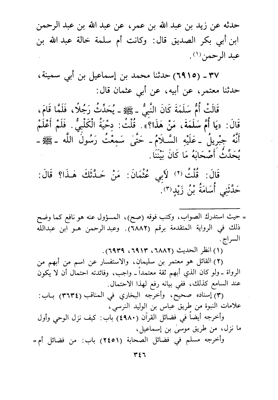 6915 - حَدَّثَنَا مُحَمَّدُ بْنُ إِسْمَاعِيلَ بْنِ أَبِي سَمِينَةَ، حَدَّثَنَا مُعْتَمِرٌ، عَنْ أَبِيهِ، عَنْ أَبِي عُثْمَانَ قَالَ: قَالَتْ أُمُّ سَلَمَةَ: كَانَ النَّبِيُّ صَلَّى اللهُ عَلَيْهِ وَسَلَّمَ يُحَدِّثُ رَجُلًا، فَلَمَّا قَامَ قَالَ: «§يَا أُمَّ سَلَمَةَ مَنْ هَذَا؟». قُلْتُ: دِحْيَةُ الْكَلْبِيُّ، فَلَمْ أَعْلَمْ أَنَّهُ جِبْرِيلُ عَلَيْهِ السَّلَامُ حَتَّى سَمِعْتُ رَسُولَ اللَّهِ صَلَّى اللهُ عَلَيْهِ وَسَلَّمَ يُحَدِّثُ أَصْحَابَهُ مَا كَانَ بَيْنَنَا قَالَ: قُلْتُ لِأَبِي عُثْمَانَ مَنْ حَدَّثَكَ هَذَا؟ قَالَ: حَدَّثَنِي أُسَامَةُ بْنُ زَيْدٍKإسناده صحيح