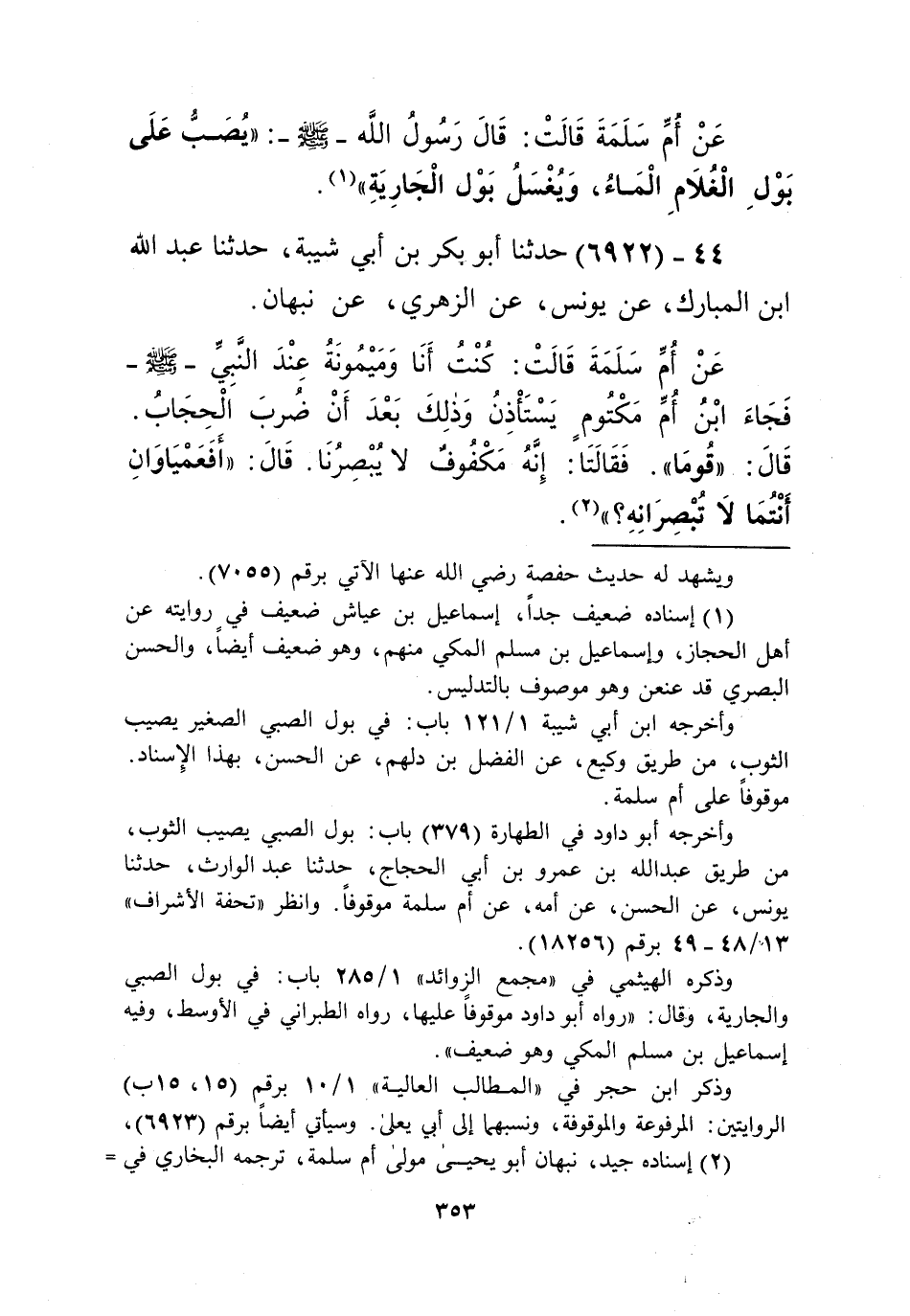 6922 - حَدَّثَنَا أَبُو بَكْرِ بْنُ أَبِي شَيْبَةَ، حَدَّثَنَا عَبْدُ اللَّهِ بْنُ الْمُبَارَكِ، عَنْ يُونُسَ، عَنِ الزُّهْرِيِّ، عَنْ نَبْهَانَ، عَنْ أُمِّ سَلَمَةَ، قَالَتْ: كُنْتُ أَنَا وَمَيْمُونَةُ عِنْدَ النَّبِيِّ صَلَّى اللهُ عَلَيْهِ وَسَلَّمَ، فَجَاءَ ابْنُ أُمِّ مَكْتُومٍ يَسْتَأْذِنُ، وَذَلِكَ بَعْدَ أَنْ ضُرِبَ الْحِجَابُ. قَالَ: «§قُومَا». فَقَالَتَا: إِنَّهُ مَكْفُوفٌ لَا يُبْصِرُنَا. قَالَ: «أَفَعَمْيَاوَانِ أَنْتُمَا لَا تُبْصِرَانِهِ؟» Kإسناده جيد