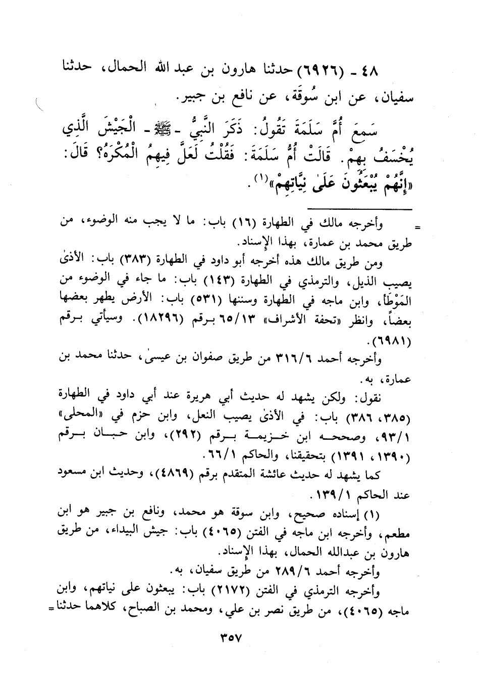 6926 - حَدَّثَنَا هَارُونُ بْنُ عَبْدِ اللَّهِ الْحَمَّالُ، حَدَّثَنَا سُفْيَانُ، عَنِ ابْنِ سُوقَةَ، عَنْ نَافِعِ بْنِ جُبَيْرٍ، سَمِعَ أُمَّ سَلَمَةَ تَقُولُ: ذَكَرَ النَّبِيُّ صَلَّى اللهُ عَلَيْهِ وَسَلَّمَ الْجَيْشَ الَّذِي يُخْسَفُ بِهِمْ، قَالَتْ أُمُّ سَلَمَةَ: فَقُلْتُ لَعَلَّ فِيهِمُ الْمُكْرَهُ؟ قَالَ: «§إِنَّهُمْ يُبْعَثُونَ عَلَى نِيَّاتِهِمْ» Kإسناده صحيح