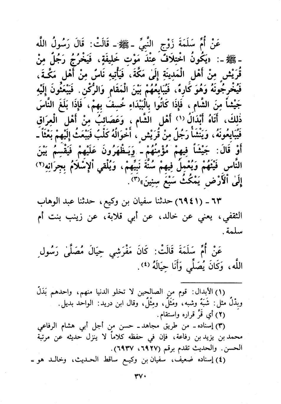 6941 - حَدَّثَنَا سُفْيَانُ بْنُ وَكِيعٍ، حَدَّثَنَا عَبْدُ الْوَهَّابِّ الثَّقَفِيُّ يَعْنِي، عَنْ خَالِدٍ، عَنْ أَبِي قِلَابَةَ، عَنْ زَيْنَبَ بِنْتِ أُمِّ سَلَمَةَ، عَنْ أُمِّ سَلَمَةَ، قَالَتْ: كَانَ مَفْرَشِي حِيَالَ مُصَلَّى رَسُولِ اللَّهِ وَكَانَ §يُصَلِّي وَأَنَا حِيَالُهُ "Kإسناده ضعيف