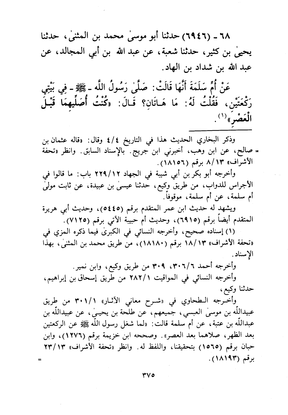 6946 - حَدَّثَنَا أَبُو مُوسَى مُحَمَّدُ بْنُ الْمُثَنَّى، حَدَّثَنَا يَحْيَى بْنُ كَثِيرٍ، حَدَّثَنَا شُعْبَةُ، عَنْ عَبْدِ اللَّهِ بْنِ أَبِي الْمُجَالِدِ، عَنْ عَبْدِ اللَّهِ بْنِ شَدَّادِ بْنِ الْهَادِ، عَنْ أُمِّ سَلَمَةَ أَنَّهَا قَالَتْ: صَلَّى رَسُولُ اللَّهِ صَلَّى اللهُ عَلَيْهِ وَسَلَّمَ فِي بَيْتِي رَكْعَتَيْنِ، فَقُلْتُ لَهُ: مَا هَاتَانِ؟ قَالَ: «§كُنْتُ أُصَلِّيهُمَا قَبْلَ الْعَصْرِ» Kإسناده صحيح