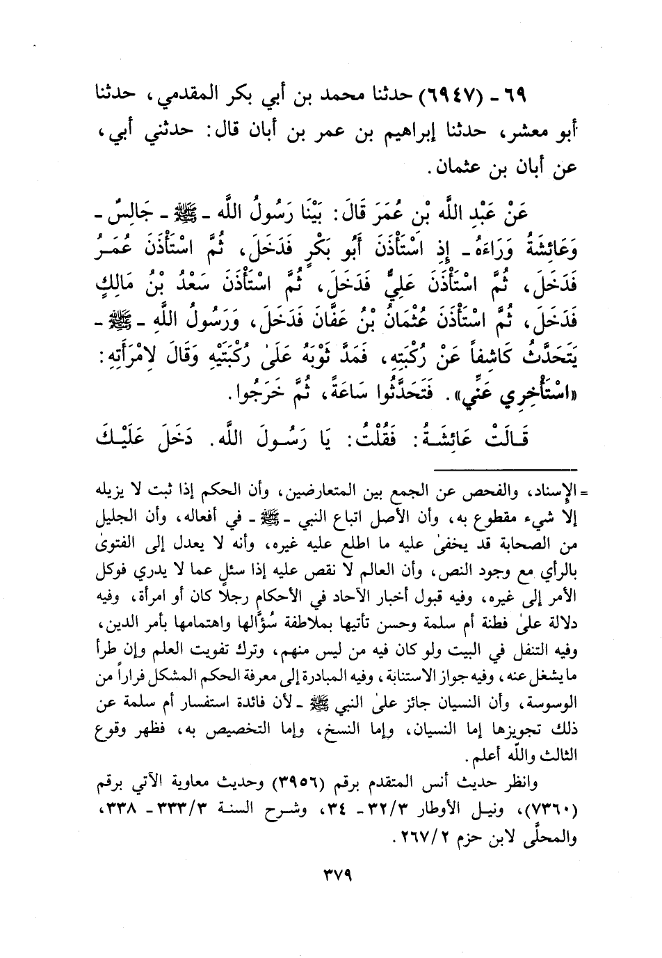 6947 - حَدَّثَنَا مُحَمَّدُ بْنُ أَبِي بَكْرٍ الْمُقَدَّمِيُّ، حَدَّثَنَا أَبُو مَعْشَرٍ، حَدَّثَنَا إِبْرَاهِيمُ بْنُ عُمَرَ بْنِ أَبَانَ قَالَ: حَدَّثَنِي أَبِي، عَنْ أَبَانَ بْنِ عُثْمَانَ، عَنْ عَبْدِ اللَّهِ بْنِ عُمَرَ قَالَ: بَيْنَا رَسُولُ اللَّهِ صَلَّى اللهُ عَلَيْهِ وَسَلَّمَ جَالِسٌ وَعَائِشَةُ وَرَاءَهُ، إِذِ اسْتَأْذَنَ أَبُو بَكْرٍ فَدَخَلَ، ثُمَّ اسْتَأْذَنَ عُمَرُ فَدَخَلَ، ثُمَّ اسْتَأْذَنَ عَلِيٌّ فَدَخَلَ، ثُمَّ اسْتَأْذَنَ سَعْدُ بْنُ مَالِكٍ فَدَخَلَ، ثُمَّ اسْتَأْذَنَ عُثْمَانُ بْنُ عَفَّانَ فَدَخَلَ، وَرَسُولُ اللَّهِ صَلَّى اللهُ عَلَيْهِ وَسَلَّمَ يَتَحَدَّثُ كَاشِفًا عَنْ رُكْبَتِهِ، فَمَدَّ ثَوْبَهُ عَلَى رُكْبَتَيْهِ وَقَالَ لِامْرَأَتِهِ: «اسْتَأْخِرِي عَنِّي». فَتَحَدَّثُوا سَاعَةً، ثُمَّ خَرَجُوا. قَالَتْ عَائِشَةُ: فَقُلْتُ: يَا رَسُولَ اللَّهِ، دَخَلَ عَلَيْكَ -[380]- أَصْحَابُكَ فَلَمْ تُصْلِحْ ثَوْبَكَ وَلَمْ تُؤَخِّرْنِي عَنْكَ حَتَّى دَخَلَ عُثْمَانُ؟ فَقَالَ: «يَا عَائِشَةُ، §أَلَا أَسْتَحِي مِنْ رَجُلٍ تَسْتَحِي مِنْهُ الْمَلَائِكَةُ؟ وَالَّذِي نَفْسُ مُحَمَّدٍ بِيَدِهِ إِنَّ الْمَلَائِكَةَ لَتَسْتَحِي مِنْ عُثْمَانَ كَمَا تَسْتَحِي مِنَ اللَّهِ وَرَسُولِهِ، وَلَوْ دَخَلَ وَأَنْتِ قَرِيبَةٌ مِنِّي، لَمْ يَرْفَعْ رَأْسَهُ، وَلَمْ يَتَحَدَّثْ حَتَّى يَخْرُجَ» Kإسناده ضعيف